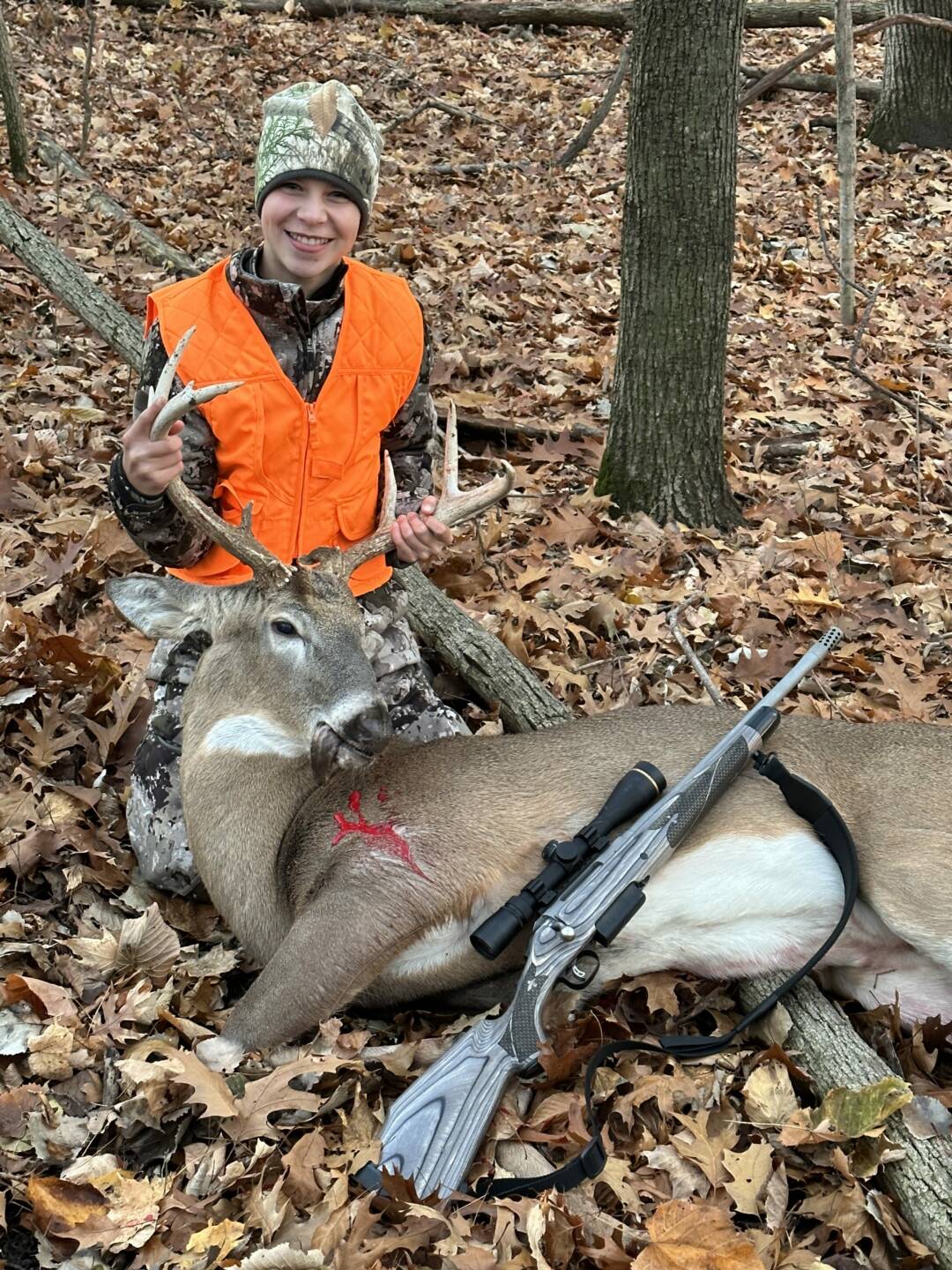 He came in heading towards a couple does that were in front of the blind. Stopped him at 50 yards and made the shot. He ran about 40 yards and went down.