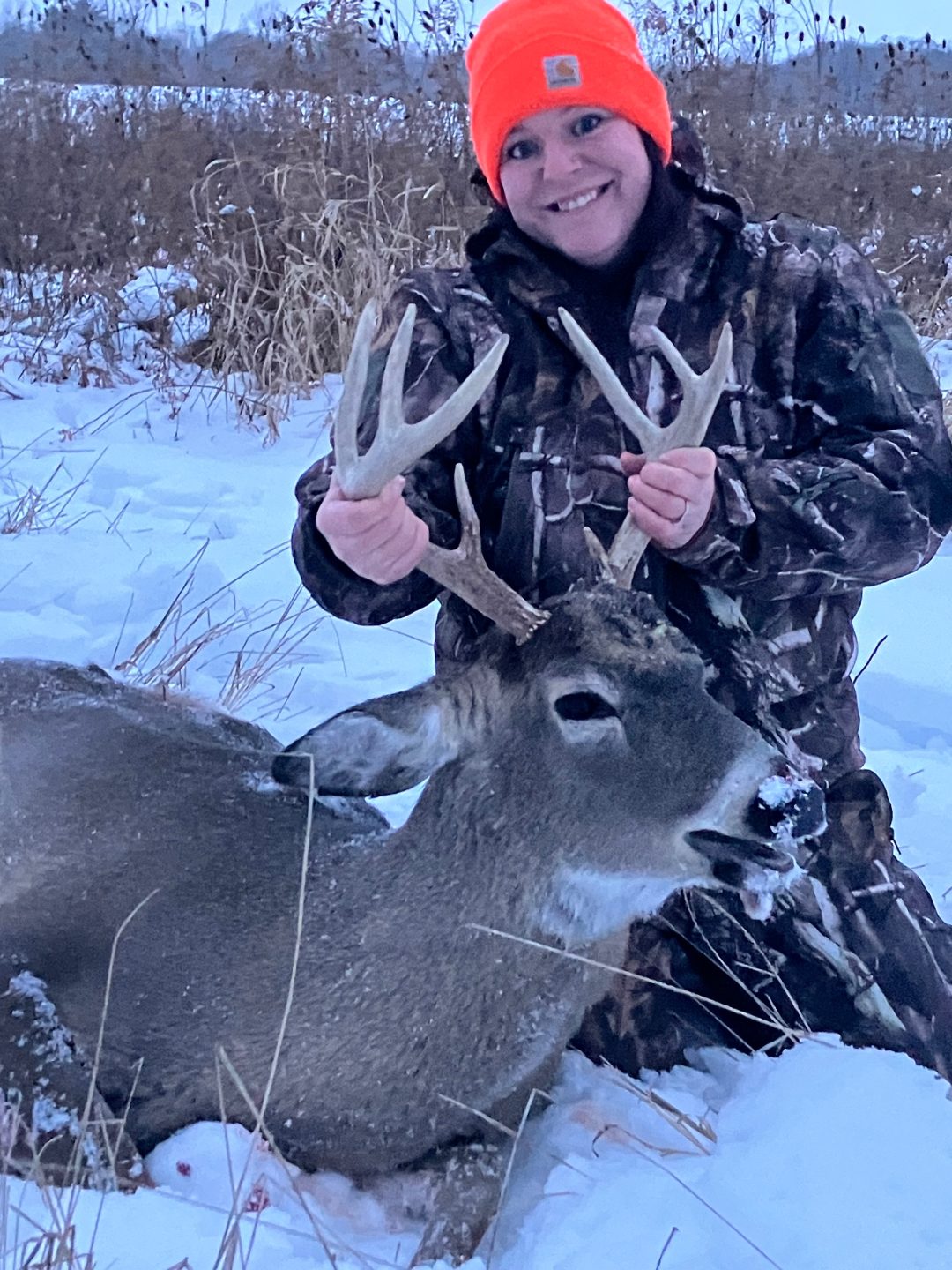 Been hunting hard almost every day since opening day, watched tons of spikes, 4-6pts and does come in daily, got skunked by a couple mature bucks and was ready to just harvest a nice doe for my first deer then this guy stepped into range and the rest was history, shot at 35 yards he ran 20 and dropped. Big thanks to my husband/hunting guide for getting me out there day after day and the good Lord for my first harvest!