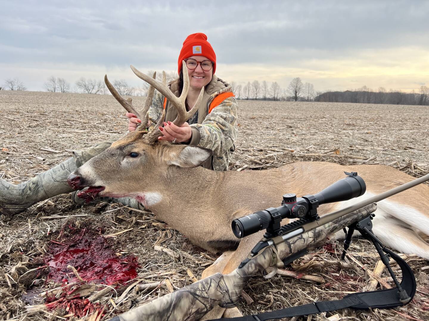 A totally unplanned stalk hunt resulted in this guy! We spotted him from the house at daylight in the corn stubble. He had a doe bedded down on a hill and then moved into a valley in the stubble. After a 400 yard army crawl stalk I laid in the dirt for over 2 hours ready to shoot when he stood up. All I could see was the top of his rack. I knew I needed to get back to the house soon to the baby so I finally started doing some mouth calling (since I lost my grunt call along the way) to try and get him to stand up. After a few minutes he stood up with his butt towards me, took a few steps away and then laid back down. I called a little more and he stood up again, this time broadside and I put him down at 103 yards. My first successful spot and stalk hunt and the best part was that my husband and kids got to watch from the house and then ride out to retrieve it with me. A hunt I will never forget!