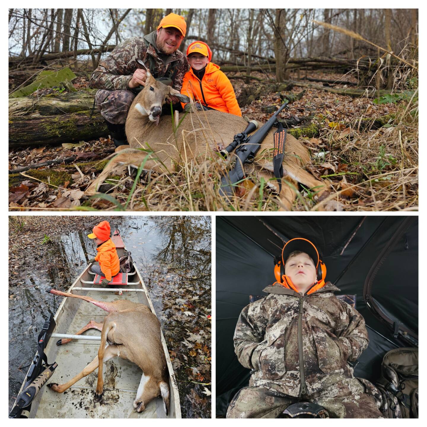 First hunt with my son Weston (5). He sat with his Papa on the opener, but didn’t have any luck. Went back out the next morning, and got to put a big doe in the freezer. She came into the food plot around 8:00 AM. Shot her at 80 yards. Weston picked up the blood trail, and tracked her the 40 yards she went. He was as happy as could be!