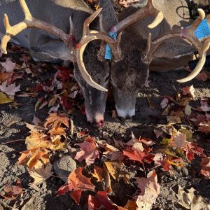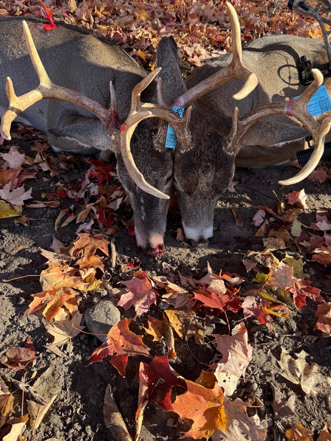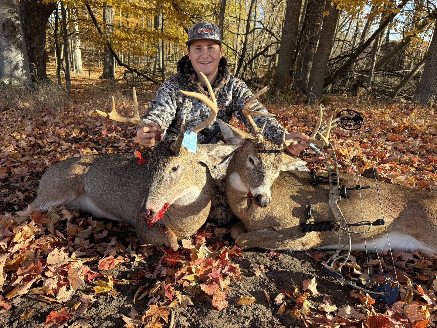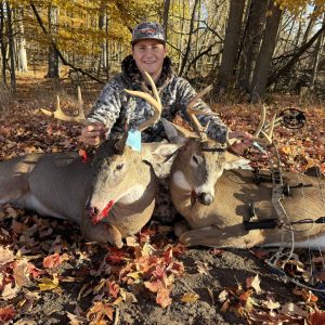 Set up a new stand last night. Got in this morning and immediately had deer all around. A group of does worked there way right underneath me, and ten minutes later started acting weird. Heard a grunt and the 8 point was already 20 yards from me. He came to a scrape 10 yards from the stand and I put a great shot on him. Just as I get turned back around I notice the 7 point coming my way to see what all the commotion was about. I quickly knocked another arrow, he comes to 25 yards and I let it fly. It’s been 8 years since I’ve got a buck and I had two down within 4 minutes of each other. Amazing morning! – Evan A