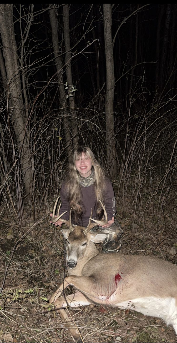 I’ve had my eyes of him through the trail cams for a hot minute. I didn’t think we’d see anything since there had been some coyote activity earlier in the day, about 50 minutes left of day light a 4 point and a spike were around the bait pile they stayed for a bit there was about 10 left of shooting time both bucks were looking out towards the back and I couldn’t hear anything, they stayed that way till about 5 minutes left of shooting time. Then I see a doe run up with him trailing right behind her, he comes in a sees both of the other bucks and all of them were moving around so quickly. He goes broadside the first time but turns so quickly I couldn’t get a clear shot, I knew I would have to make the shot quick if he turned broadside again and thankfully this brute did I couldn’t have done it without the help of my boyfriend begin there to tell me take this shot!