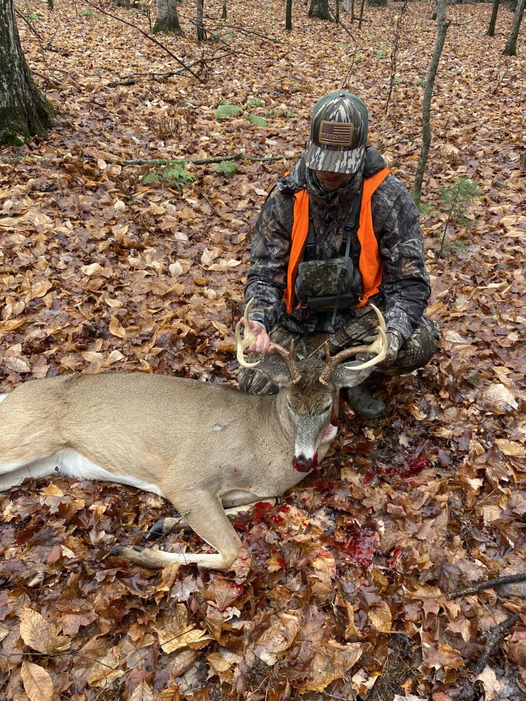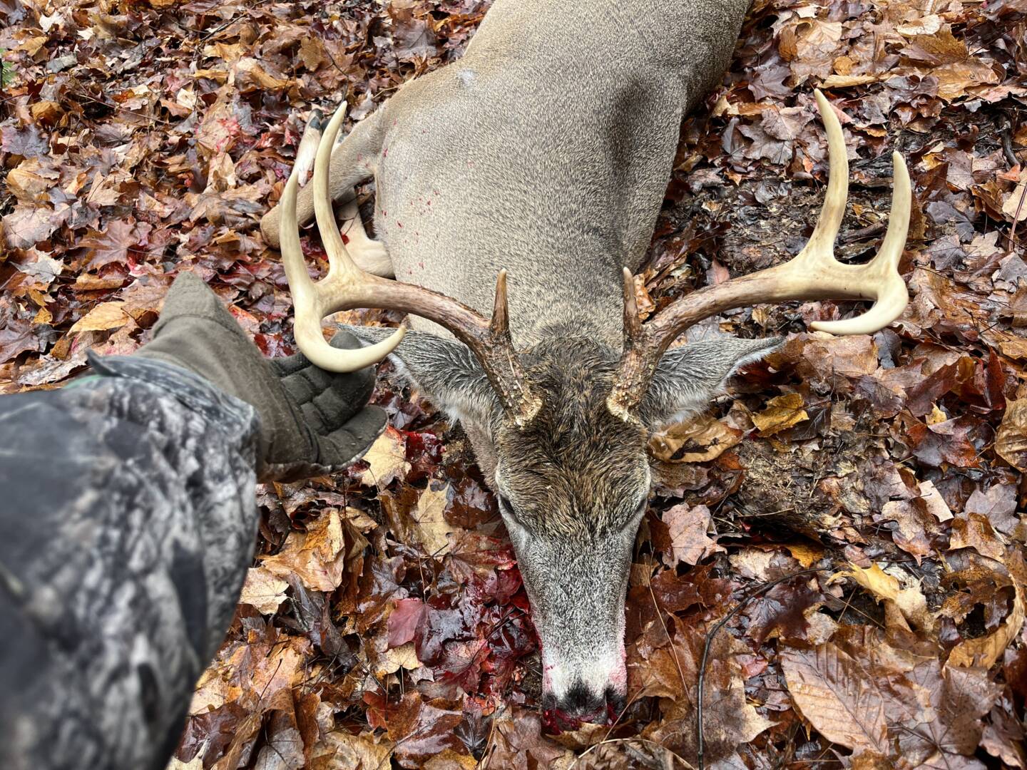 This buck came in on a hot doe trail. He stopped at about 5 yards and looked up and me. After a two minute stare off he finally put his head back down and ran off. I was able to stop him at 75 yards. Took the shot and dropped him. The 30-06 never lets me down! Thank you Lord for an amazing hunt and a great buck!