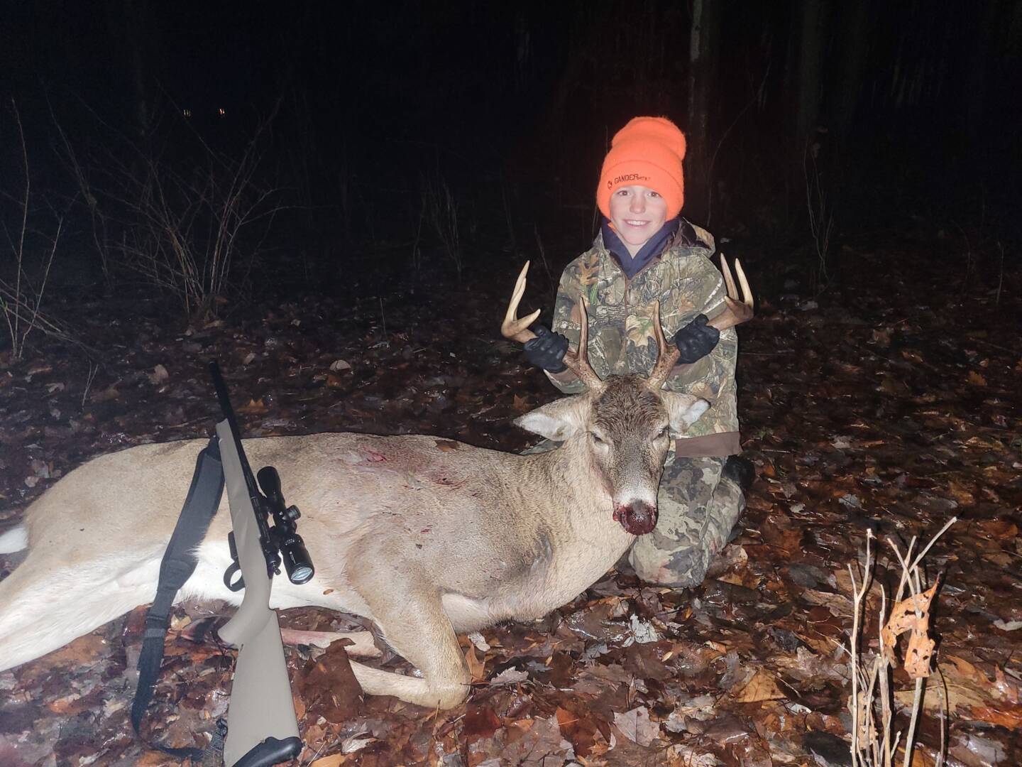 11 yr old Gavin has hunted hard all season, was able to take two antlerless deer, one with his bow and one with the gun but kept hunting, hoping for a chance at a buck. Tonight it finally happened and it just happened to be a big one! A well placed shot with the .350 and a short 80 yard track and he had his hands on him.