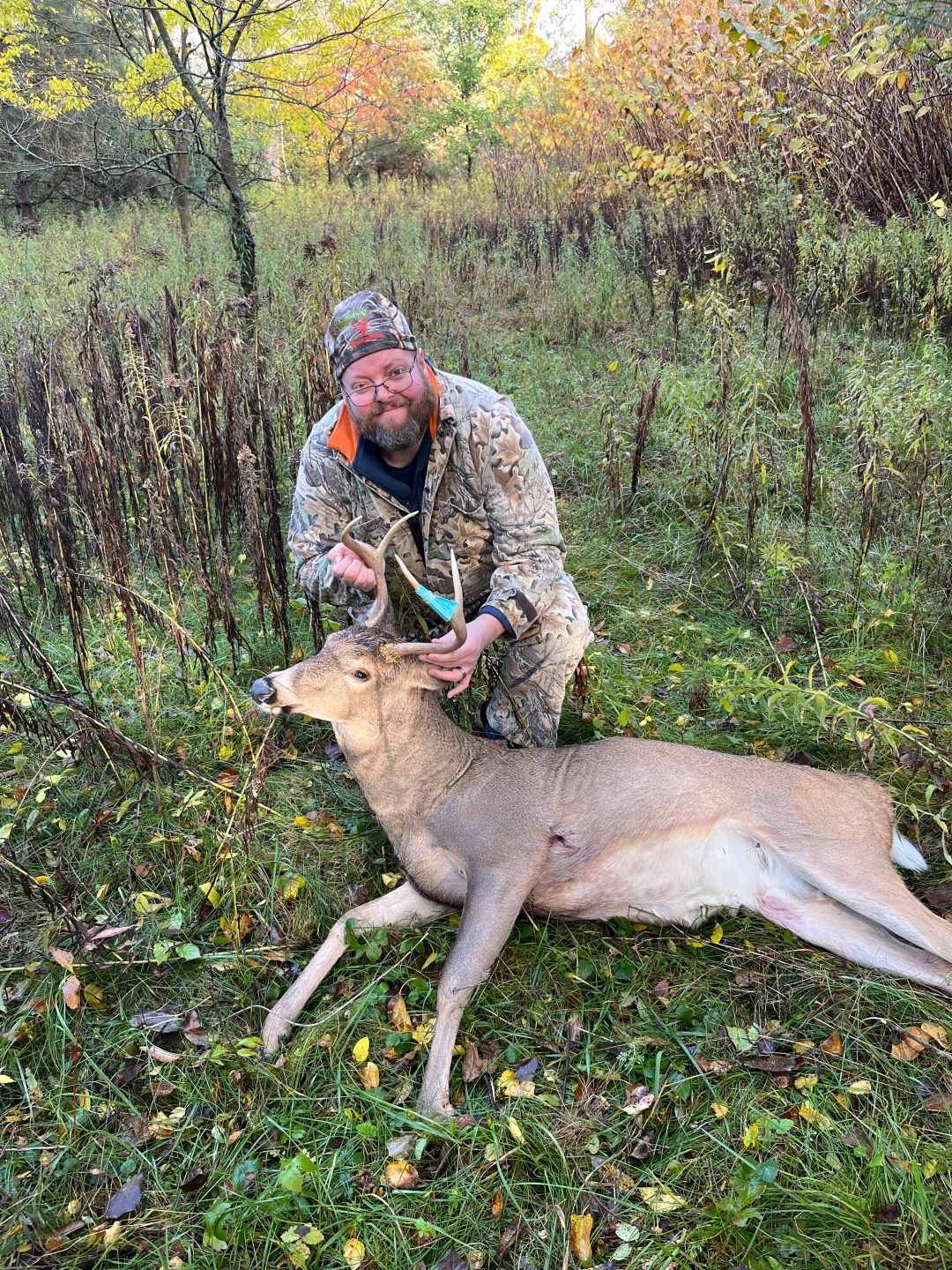 Took my old hunting partner out to the blind with me just to get him out of the house. In the blind less than 45 minutes when the first doe showed up. Five minutes later another doe showed up followed by the buck we had named finger guns because of how his antlers curved. He stepped out at 30 yards and it was all over he turned and ran about 40 yards before stopping and standing it the thick stuff. Watched him for 20 more minutes and then backed out since he was still on his feet. Came back in the morning and he was laying right where we left him. Thankful for a successful hunt with an old buddy.