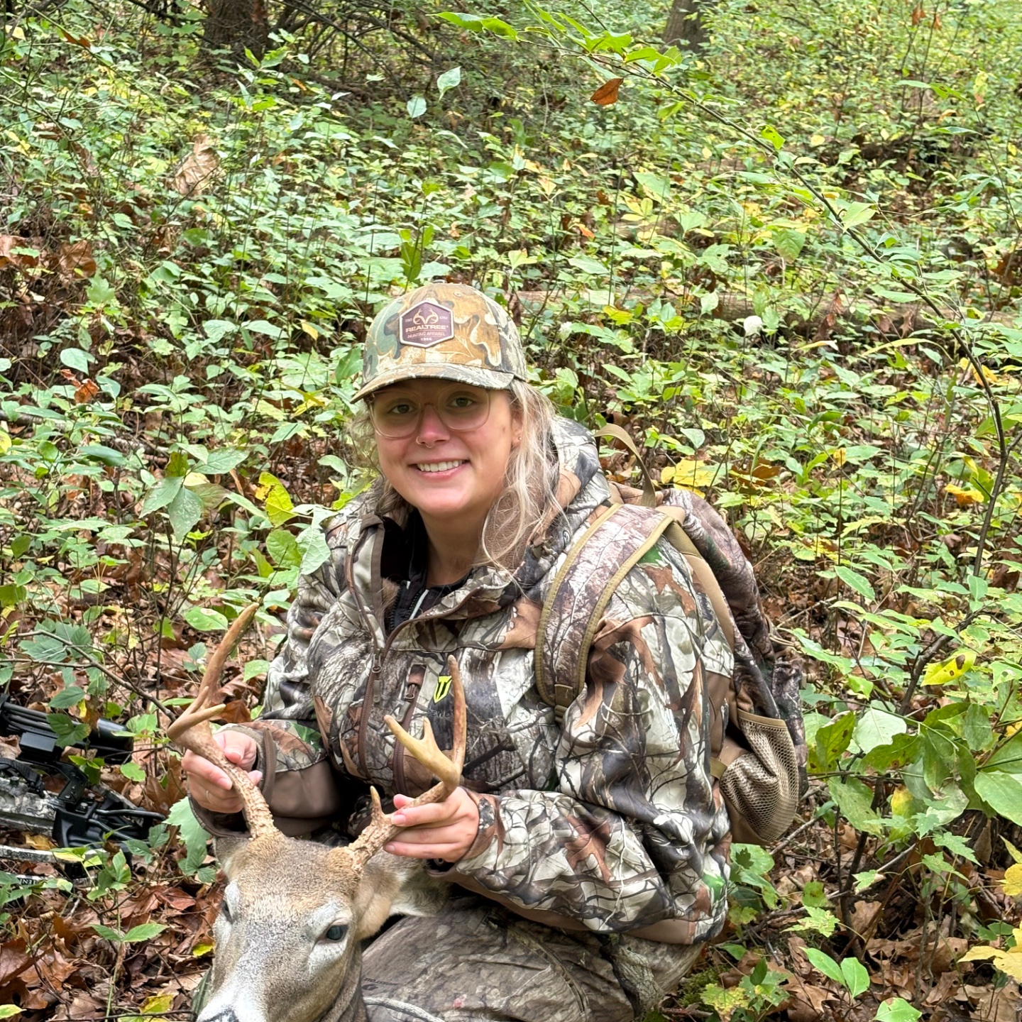 My first buck! After many years of hunting public and private land and the switch to fixed broad heads I was able to harvest my first buck. This guy snuck right up next to me, it was a soggy morning out there. Stood broadside 30 yards in front of me and i took my shot! Watched him run about 80 yards and crash. It was a beautiful morning for a beautiful buck. Couldnt have done it without all the help from my boyfriend and all the years of experience i have learned from hunting with my Dad. Happy hunting!