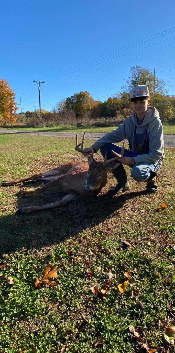 I was in the stand and he came in grunting and chasing a doe and I watched him breed the doe and they took off well. About 30 minutes later the buck came back but a little too far so I grunted him in to about 6 yards and shot him and he dropped and rolled around a little bit and then took off, and we couldn’t find him the night of the shot so we came back the next morning and found him about 500 yards from the shot.