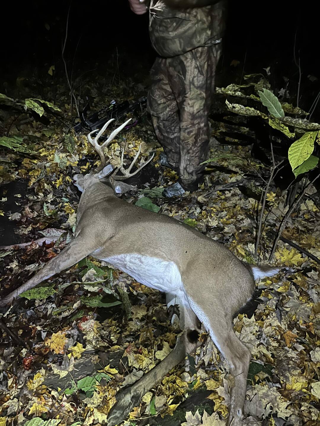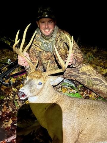 This SW MI buck came through Saturday at 6:00 PM, following the same trail that a smaller buck was pushing a doe on earlier in the night. A mature buck grunt caught his attention, and pulled him in to 35 yards. A 50 yard run and it was all over!