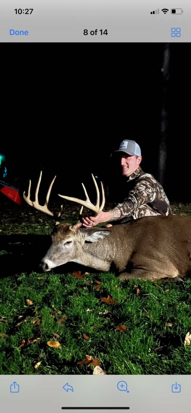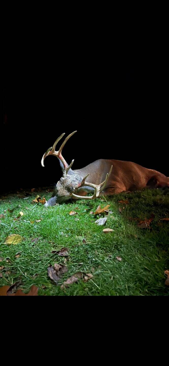 Have been watching this buck since the middle of summer. Showing up on various cams sporadically. Hadn’t seen him until that night. Watched him follow a doe into a field about 200 yards away. Hit the horns together and he came in on a string to 5 yards. Had a stare off for probably 20 seconds until he turned around. Had about 5 seconds to get a shot off once he turned around. Not the greatest shot but he made it less than 30 yards.