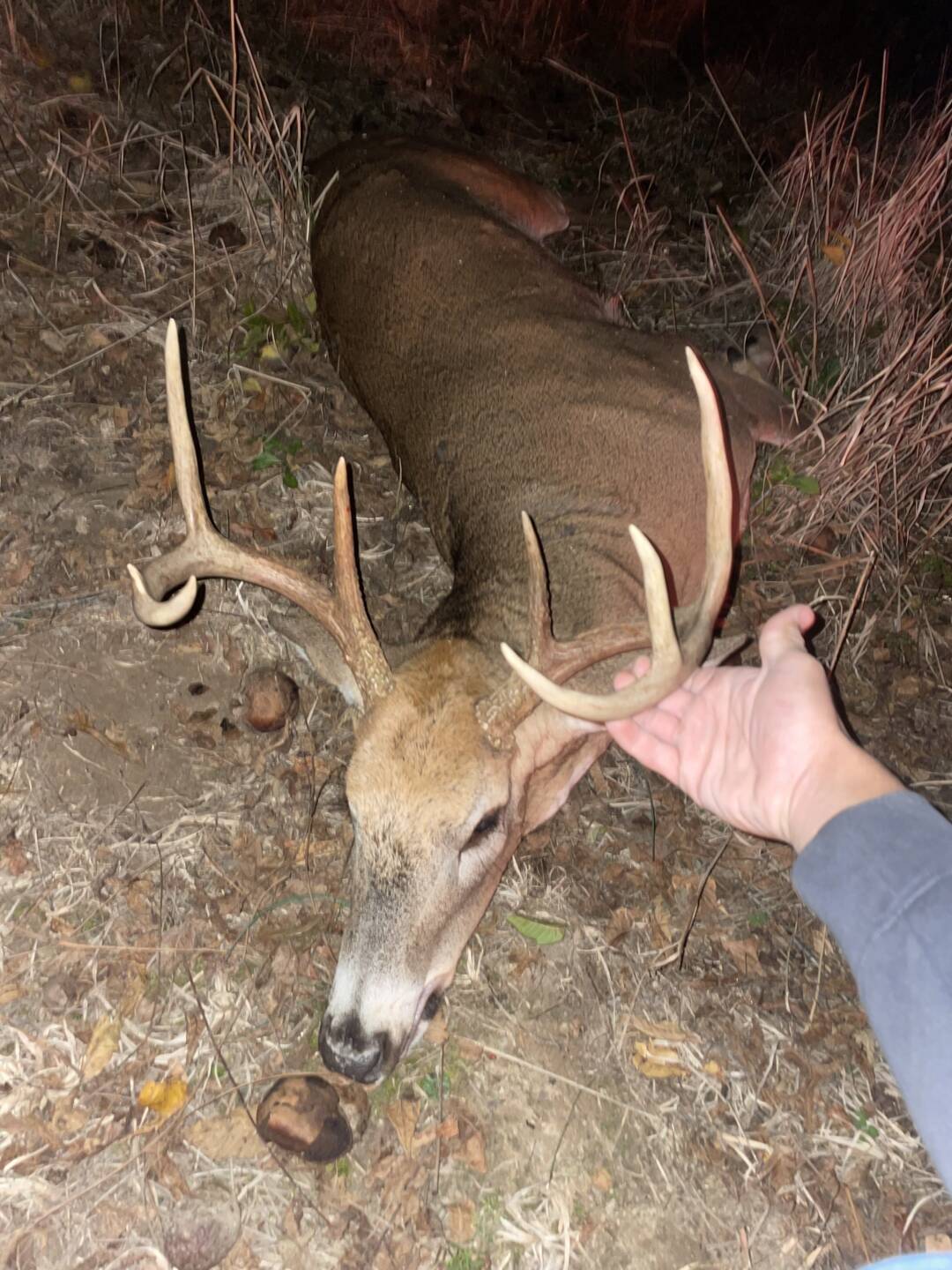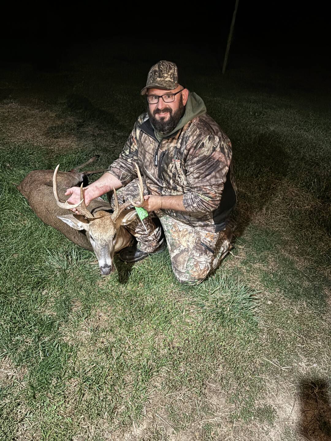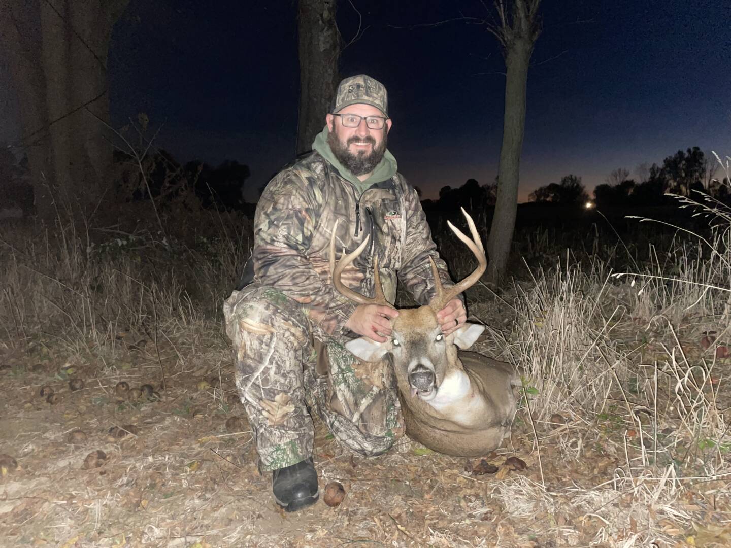 I was sitting in a tree line between a cut bean field and a freshly cut corn field. There were 14 doe and fawns around me from directly under my stand out to 40 yards. The 2 doe under me looked to the south and headed north, I thought I somehow spooked them. Then I caught movement coming from the south. He came cruising in and stopped in my shooting lane at 15 and gave me a perfectly broadside shot. He only made it 45 yards from where my arrow was.