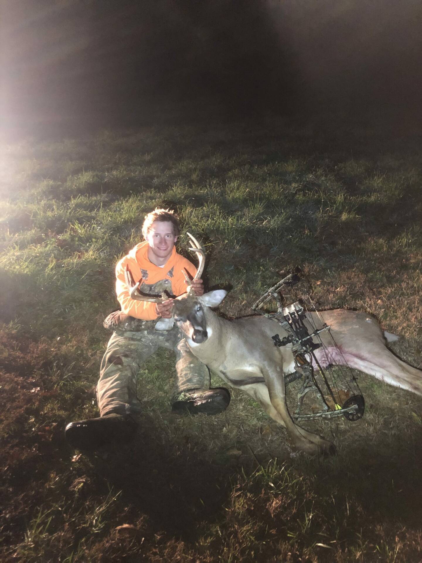 I got out of work and rushed home to get in the stand. I realized they were running the corn right next to the swamp I hunt so I hurried up and got in the stand. I was in the stand 15 minutes and had deer everywhere. This guy popped out into the field hot on a doe, I grunted twice and he came right in. 5 yard shot and he ran through the thickest stuff possible for what felt like a mile. He piled up under a dead tree and I was finally able to get my hands on him.