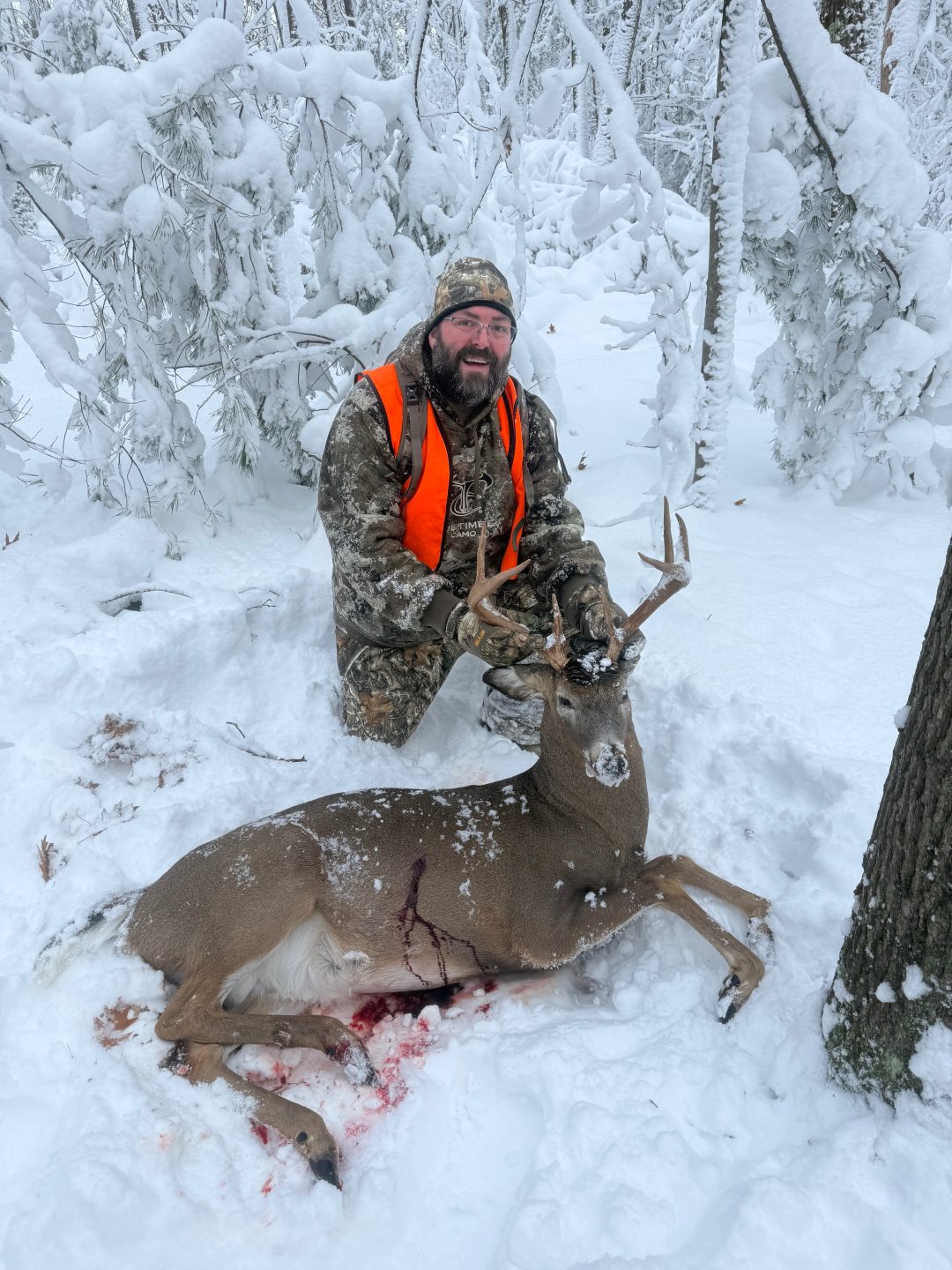 I wasn’t expecting to see much with 13” of fresh snow on the ground and the fact that I had only seen 2 other deer all season. I had a big doe come in but with all the snow weighing down the branches she never presented me with a decent shot. I was pretty bummed out because I knew it was one of my last times out up there this season, next thing I know I caught movement to my left and there he was. I didn’t have time to think or really tell how big he was I just knew he was a nice one. I stopped him at 75 yards and the 350 did the trick. 100 yard track and there he was.