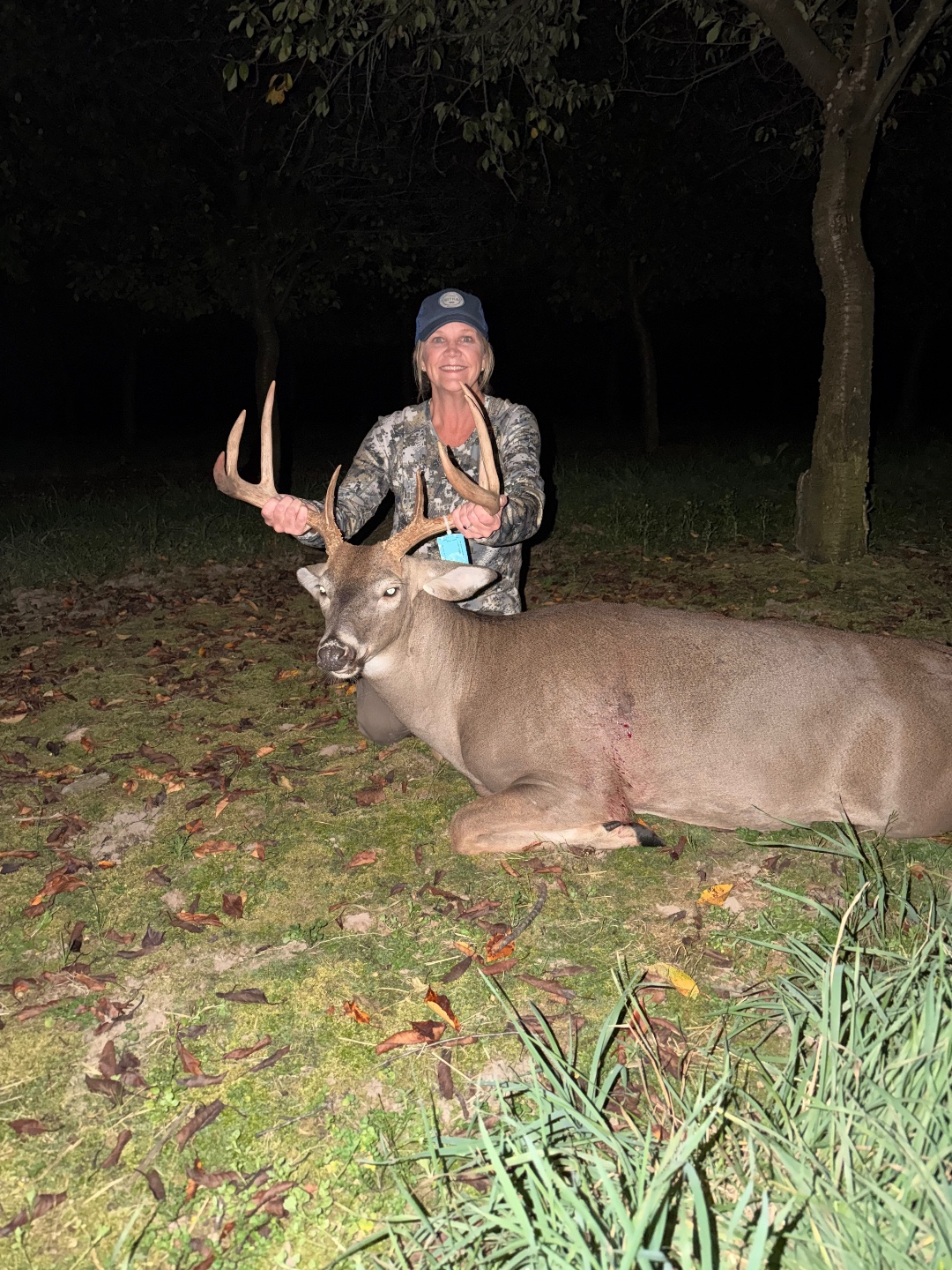 My husband set up a pop up blind overlooking trails leading to an orchard that the deer feed in. He was the second buck to walk by, following 4 doe. It was a 30 yard shot and he only ran a little ways before he died. This is my fourth buck, but first big one!