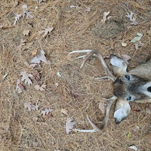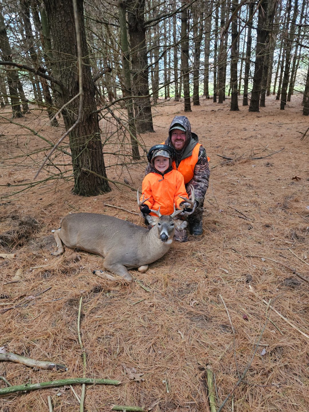 We have been fighting the wind both opening day and today. I told the gang I had a feeling deer would be moving around 10am, so we need to sit out at least until then. Sure enough, at 9:55am here come 4 doe and this guy along with a smaller buck! I had to take a quick shot as they were all running through the field. Once he stopped, it was all over from there!