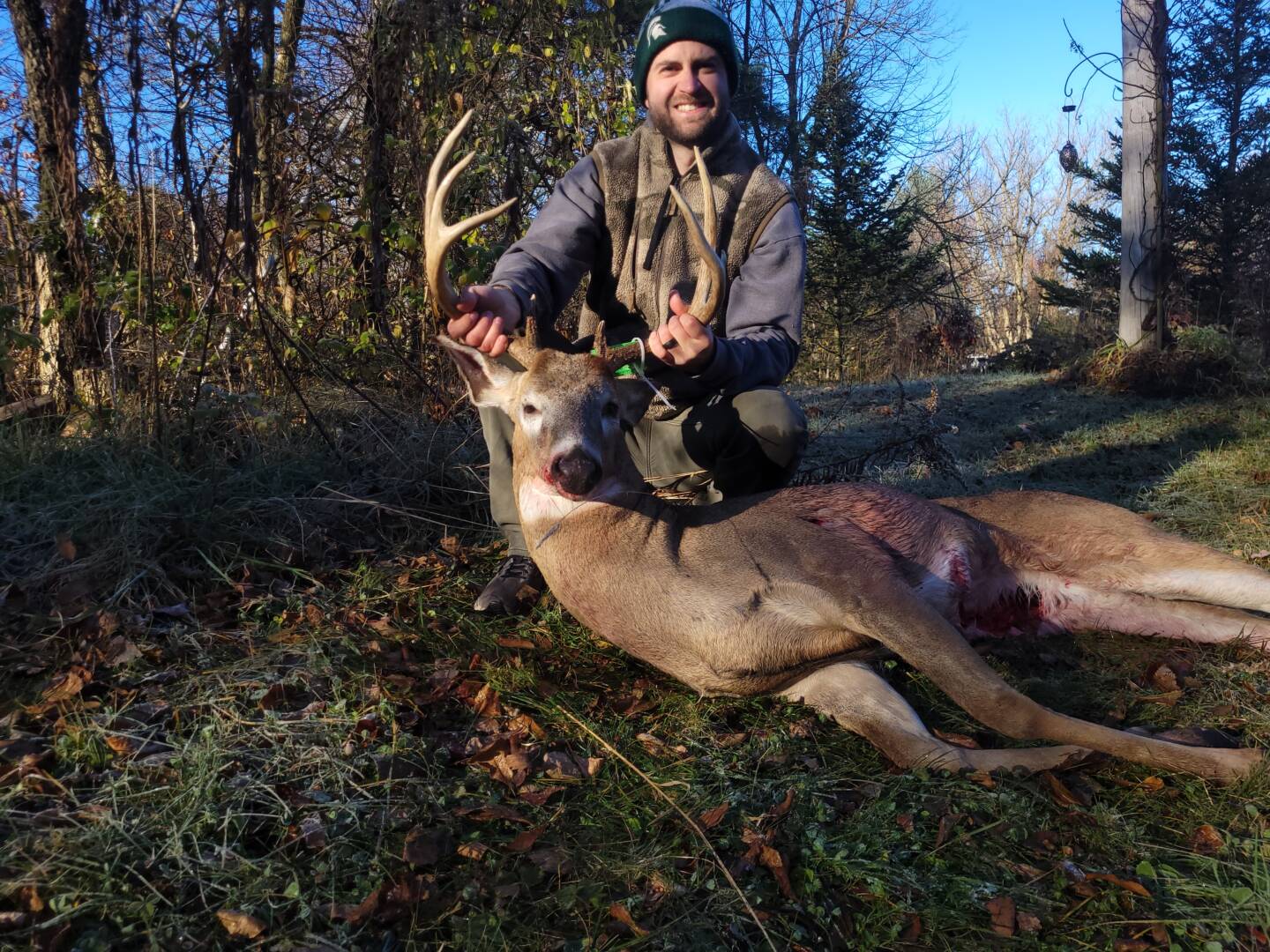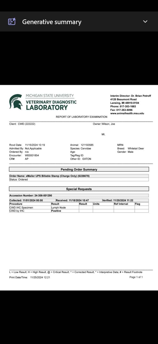 I saw him a week prior and was able to kill him on 11/1/24. He had a unique rack but by all appearances seemed like a normal buck. I sent his lymph nodes in for testing at MSU like I do for all deer and received a positive result, much to my surprise. I encourage everyone to get their deer tested before consuming them.