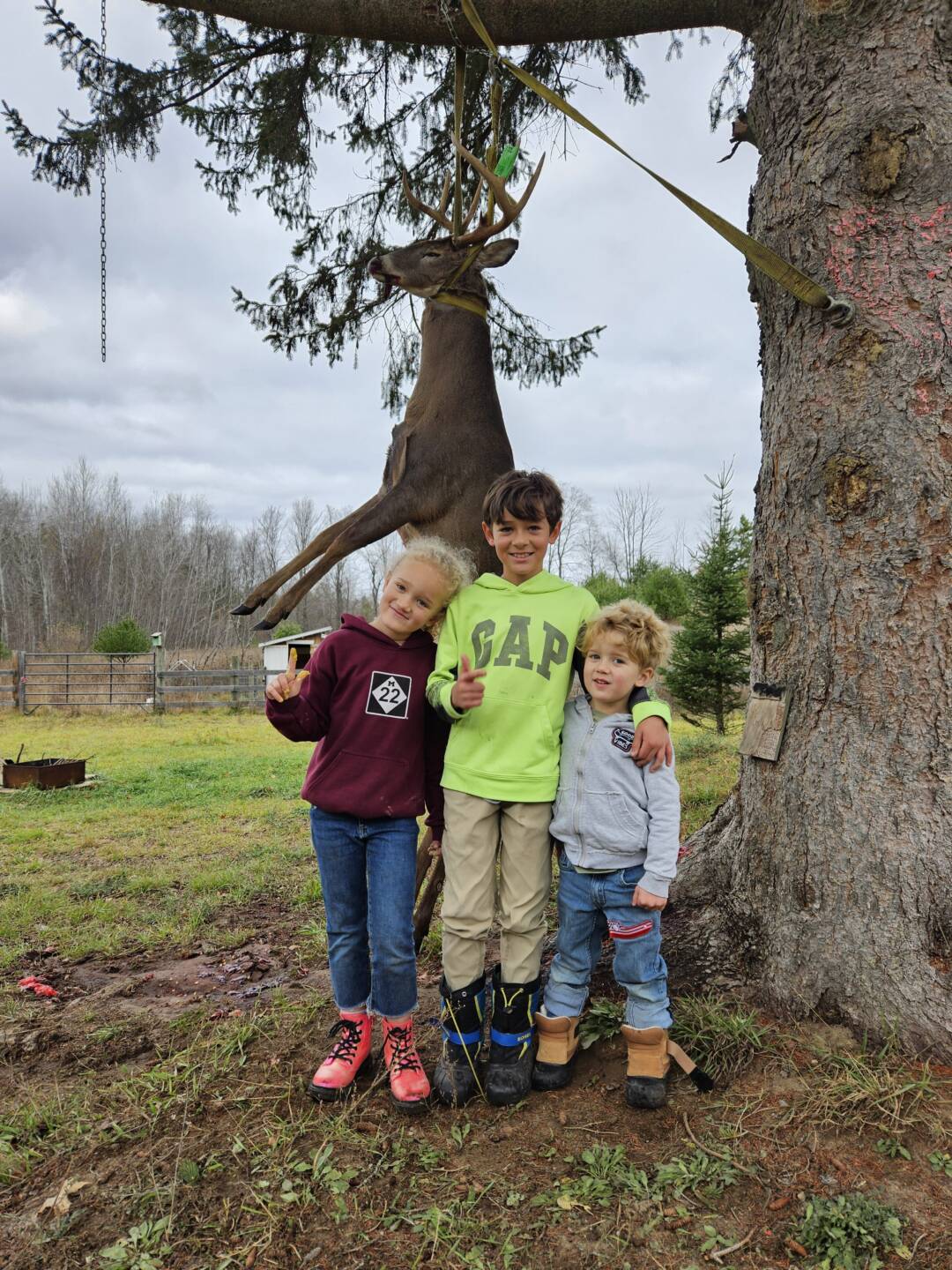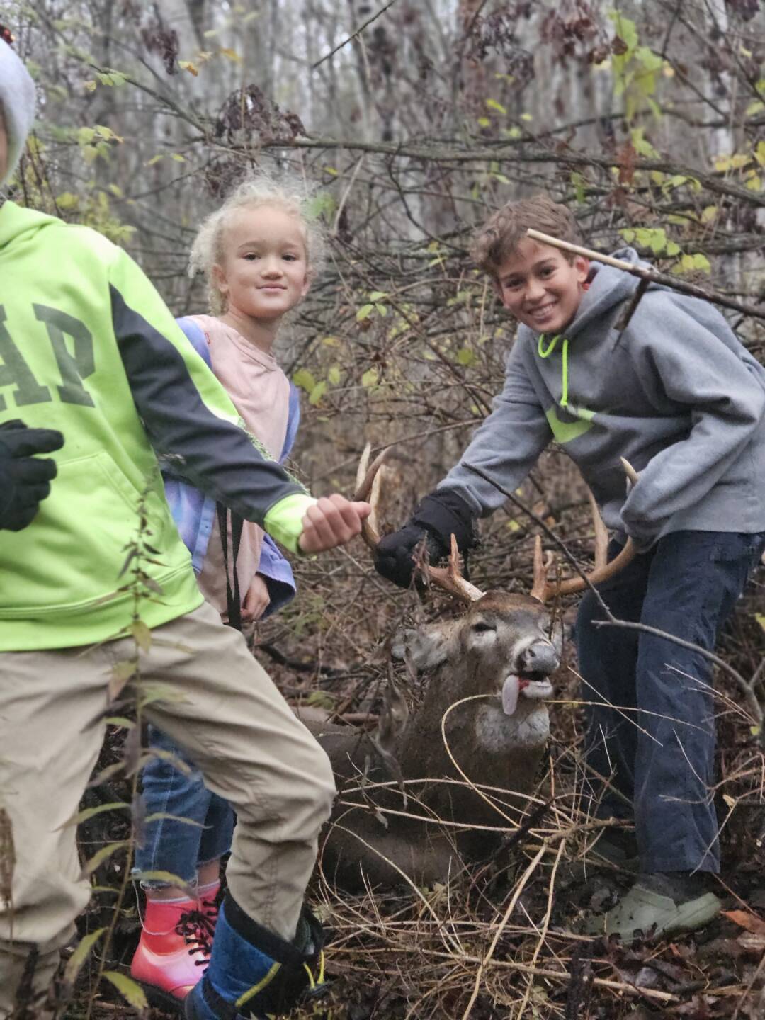 The Kids were sleeping in, so I snuck out to the backyard stand just before 7. It was the only morning I was able to get out after battling the flu all month. I was already shaking my head at the late start when I had to cough a few times. I figured I might as well blow a couple grunts to confuse anything close enough I may have startled. At first light he came in slowly and even scoping him I couldn’t quite make out his exact size. One shot at 75yds and he bolted straight towards me, under the stand and right up my trail towards home. I heard him crash down in a little thicket by the goats. Gave my prayer of thanks, climbed down, woke up the Kids and all of us went to “track” him. Sharing that morning and having the kids be a part was the best.