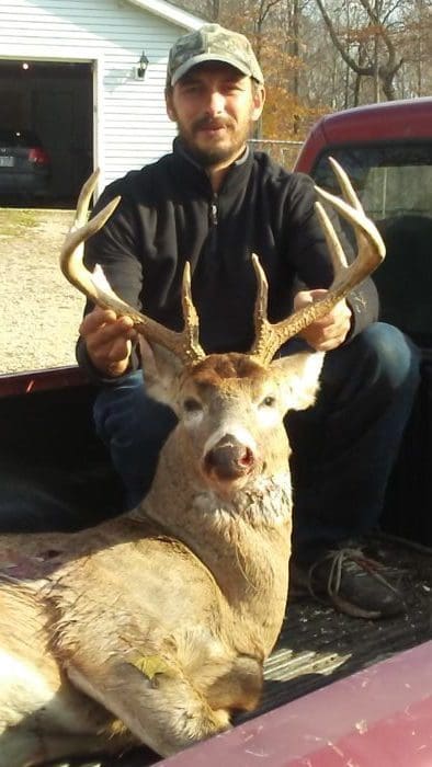 I was walking out to stand and seen deer in the field so i just sat in the closes stand. I heard a few shots then down the fence row came this nice 10 point. I grunted and he stopped behind a tree i leaned over shot him.