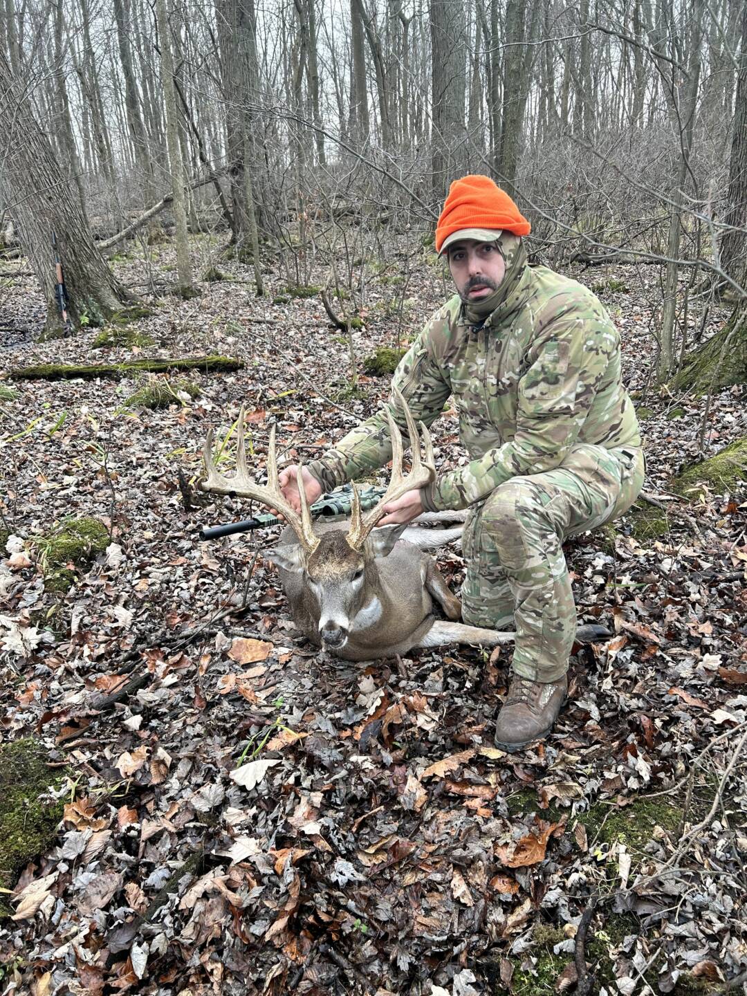 My first deer ever taken. I’ve only been hunting for 4 years. Saw another buck of this caliber about 20 minutes before and was unable to get a shot off before he disappeared through the thicket. Kicked myself the whole time, just when I was about to call it a day I turned and saw this behemoth about 25 yards away looking straight at me. Totally thought he spotted me and was about to run. He turned his butt towards me and I was able to get my gun up and he then turned and gave me a perfect side shot.
