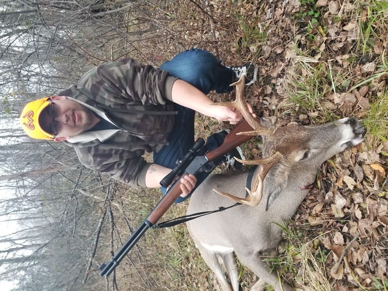 Went into the blind for an evening hunt, buck and was laying down when I got into the blind already. Had him in the scope waiting him out for over an hour, he was quarter away from me on the ground butt toward me only shot available was a neck shot for my first mounter. Shooting a .44 mag about 10 minutes before my corn feeder would go off and I thought would spook him I made the decision to shoot. 1 shot clean shot threw the neck and he was done. 15 minutes later I was arm deep into cleaning him out