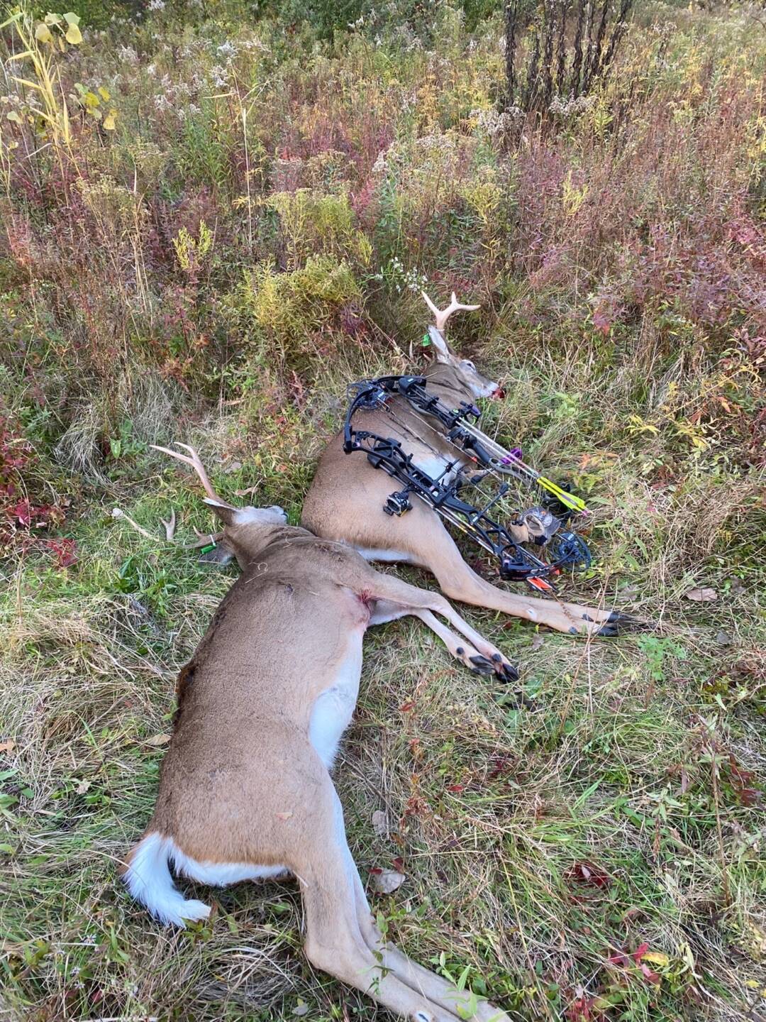 My cousin and I decided to go hunt the afternoon after work, we had three shooters that were on camera that morning knew they had to be bedded close. We both snuck into the stand around 3pm. At 4:56pm I looked up and our tall 8 was standing at 32 yards he closed the gap, I shot him at 16 yards he ran 40 and died in the field behind my stand. At 5:30 my cousin who was hunting the field edge 100 yards behind me asked if I got down and looked at my deer. I said no I didnt want to mess up his hunt . He said you won’t go check it out. I get down sneak to my deer put my hand on it , my cousin texts me STOP GET DOWN me confused reading my phone, then a text from him that says I just killed the big nine!! He ran 20 yards and died in the field 60 yards from where my deer was! Great day in the woods and glad I could double up with my cousin.