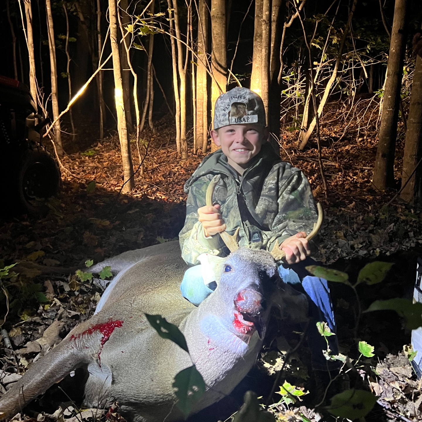 Got my first deer with my grandpa Bob !! A smaller 8 came in but not a good shot…. so we patiently waited than he showed up and gave me a great shot between a few trees !