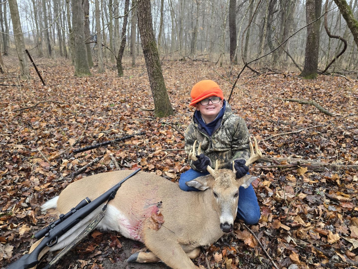 Went hunting with his dad Thursday morning, by 7:30 am he was already complaining that he hasn’t seen a deer. Him and his dad were facing opposite directions looking. His dad told him to slowly stand up and turn around that he spotted a buck. He turned around, dad handed him the gun and after a few seconds/minutes of getting the gun set up for a shot, he took his shot and the buck fell. He was so excited that he started shaking from excitement and their hunting blind shook too.