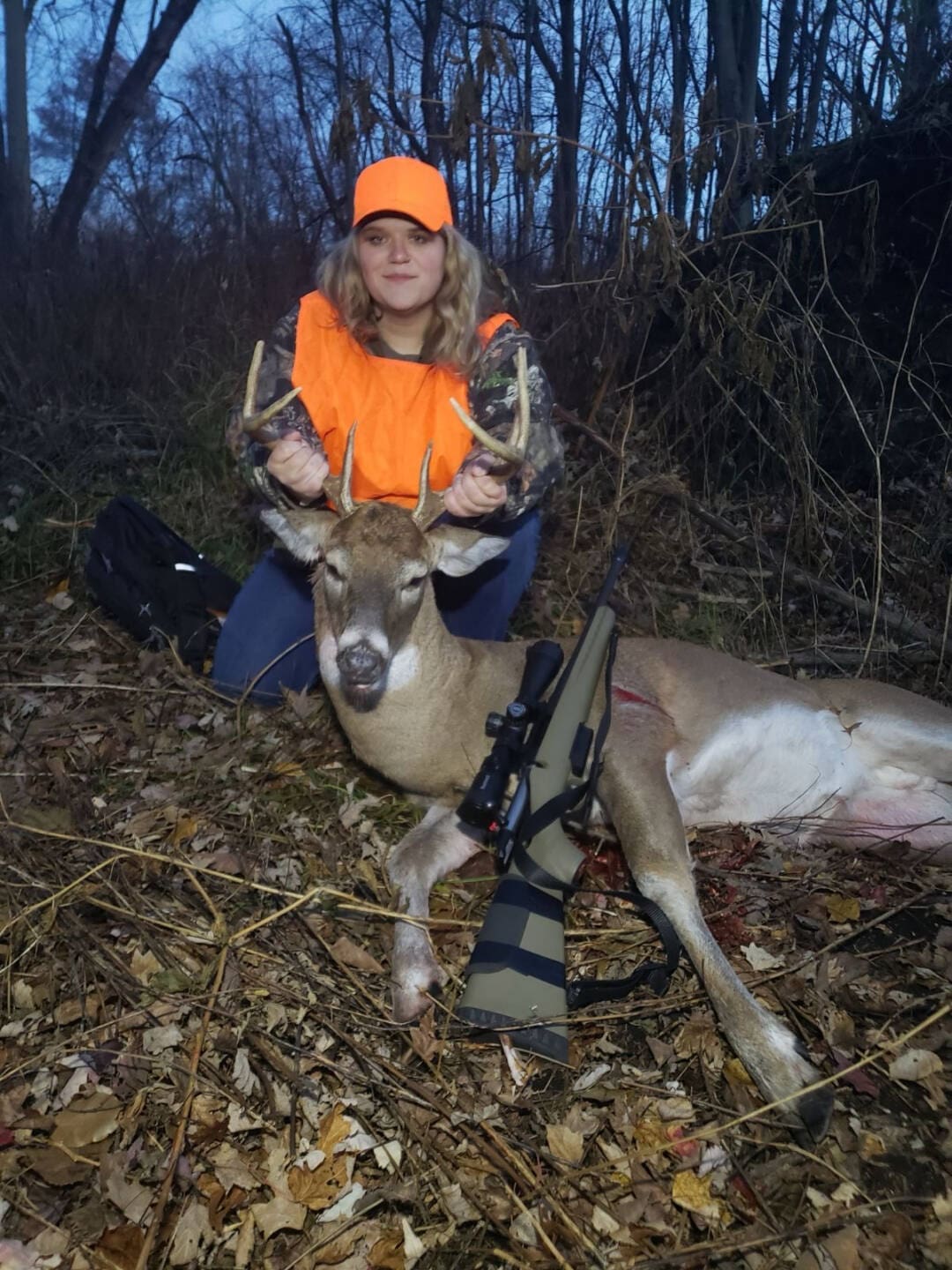 This guy came out trailing behind two does. They were very cautious and sniffing the air and staring at me. As soon as I grabbed my gun I heard some rustling from my right side window and another good sized buck came running by sniffing the ground and wasn’t stopping. I look back out my window and don’t see my buck anymore. Feeling discouraged I play a call and all of a sudden he comes out of the little wooded are beside me and he’s on the move. I try getting him to stop, but it wasn’t working and he was almost to the woods. So I tap on the window of my blind, and with my luck he stops and I’m able to put a good shot on him!