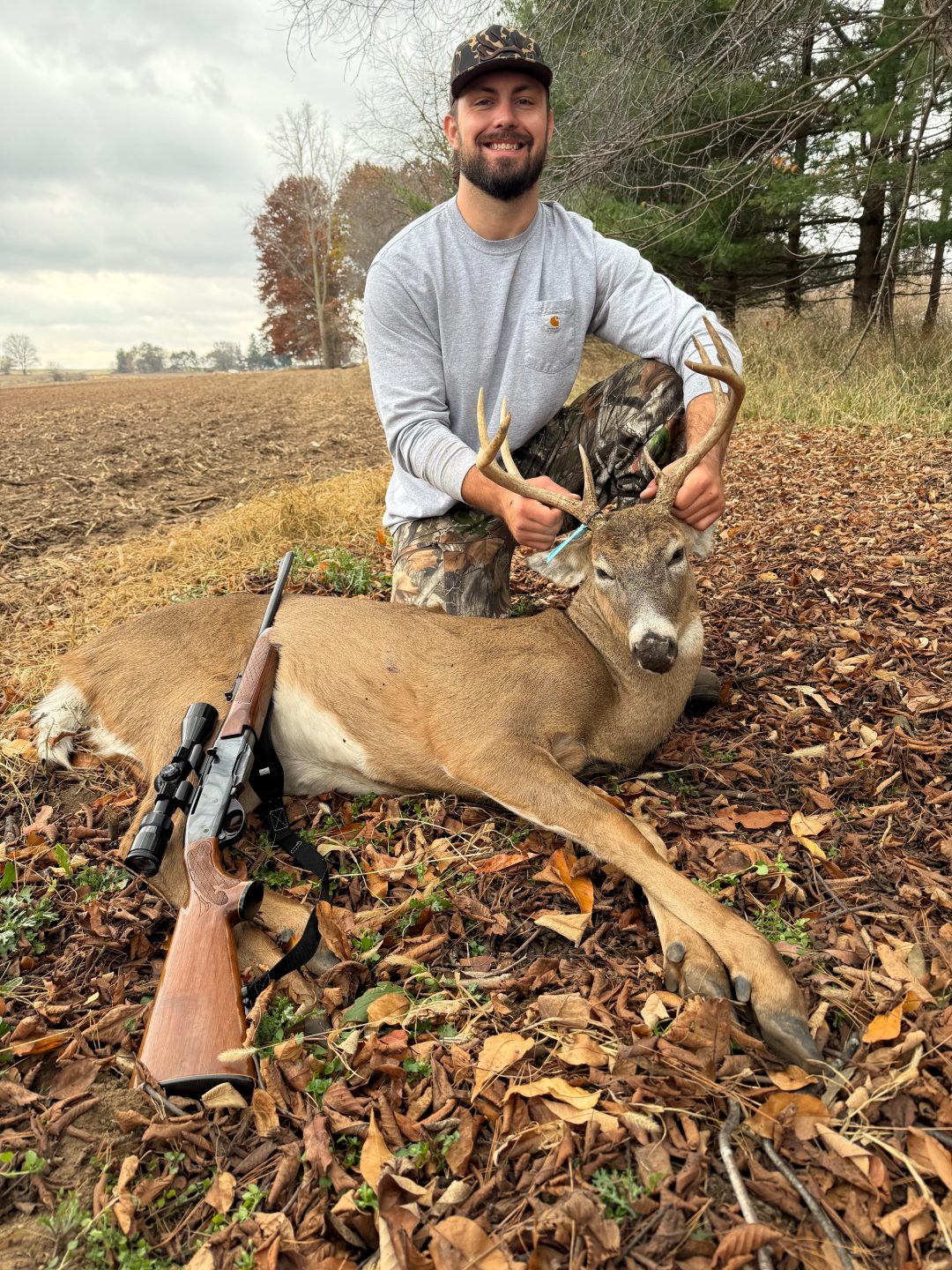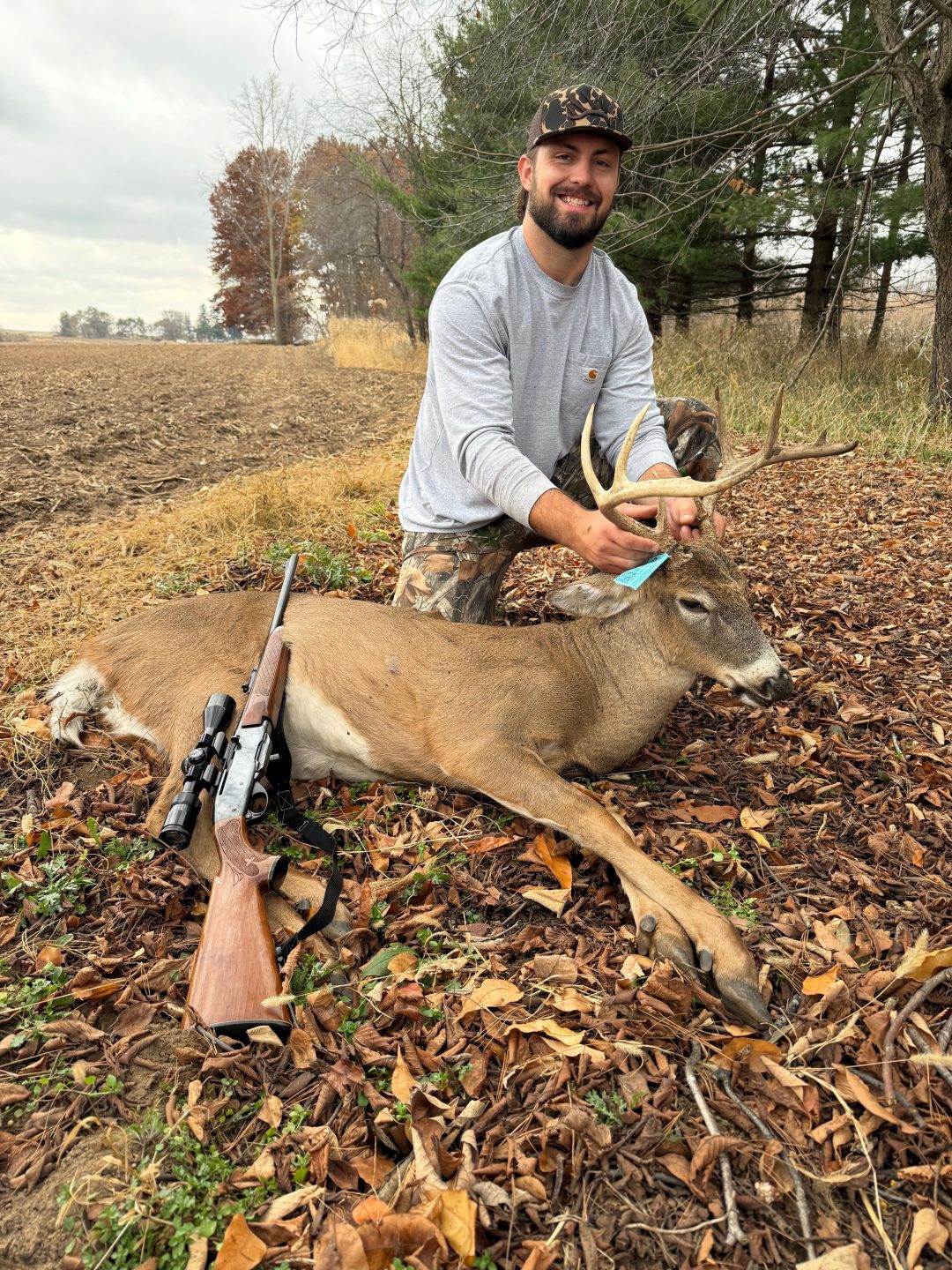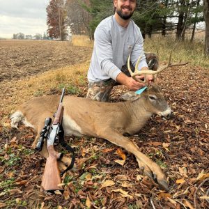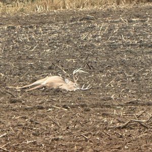 Thought it was going to be a long boring day with the warmth and wind, until about 10:15, 20+ deer started moving my way and this guy was trailing the group, stopped at 60 yds and the ol Remington Woodmaster 30-06 did the rest. -Keegan C