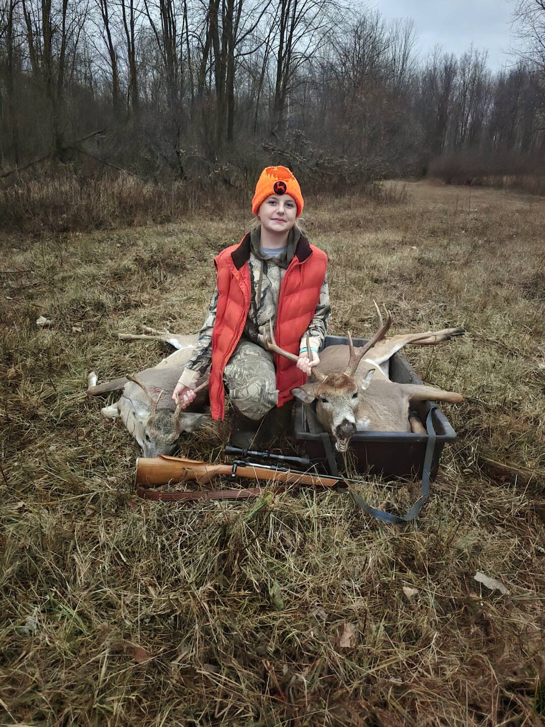 Hi, I’m 12 years old and it’s my first year hunting. I was blessed to get two bucks 20 minutes apart. My first one was a five point and my second one was an eight point.