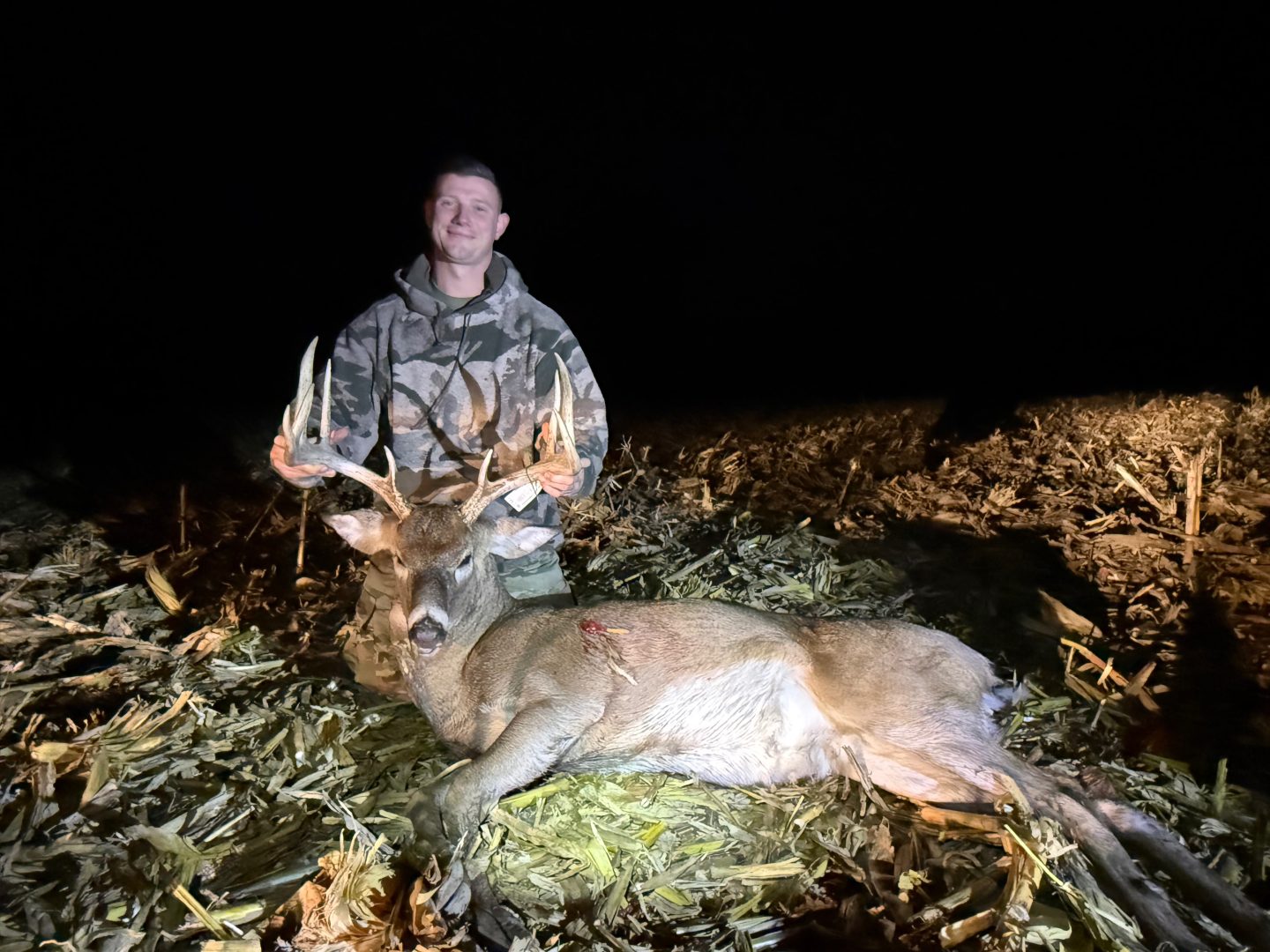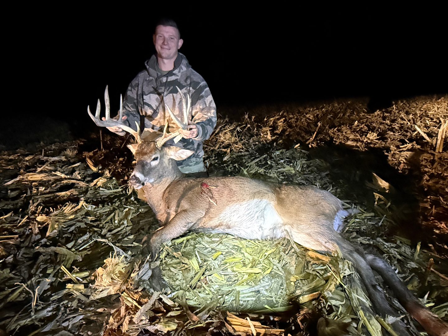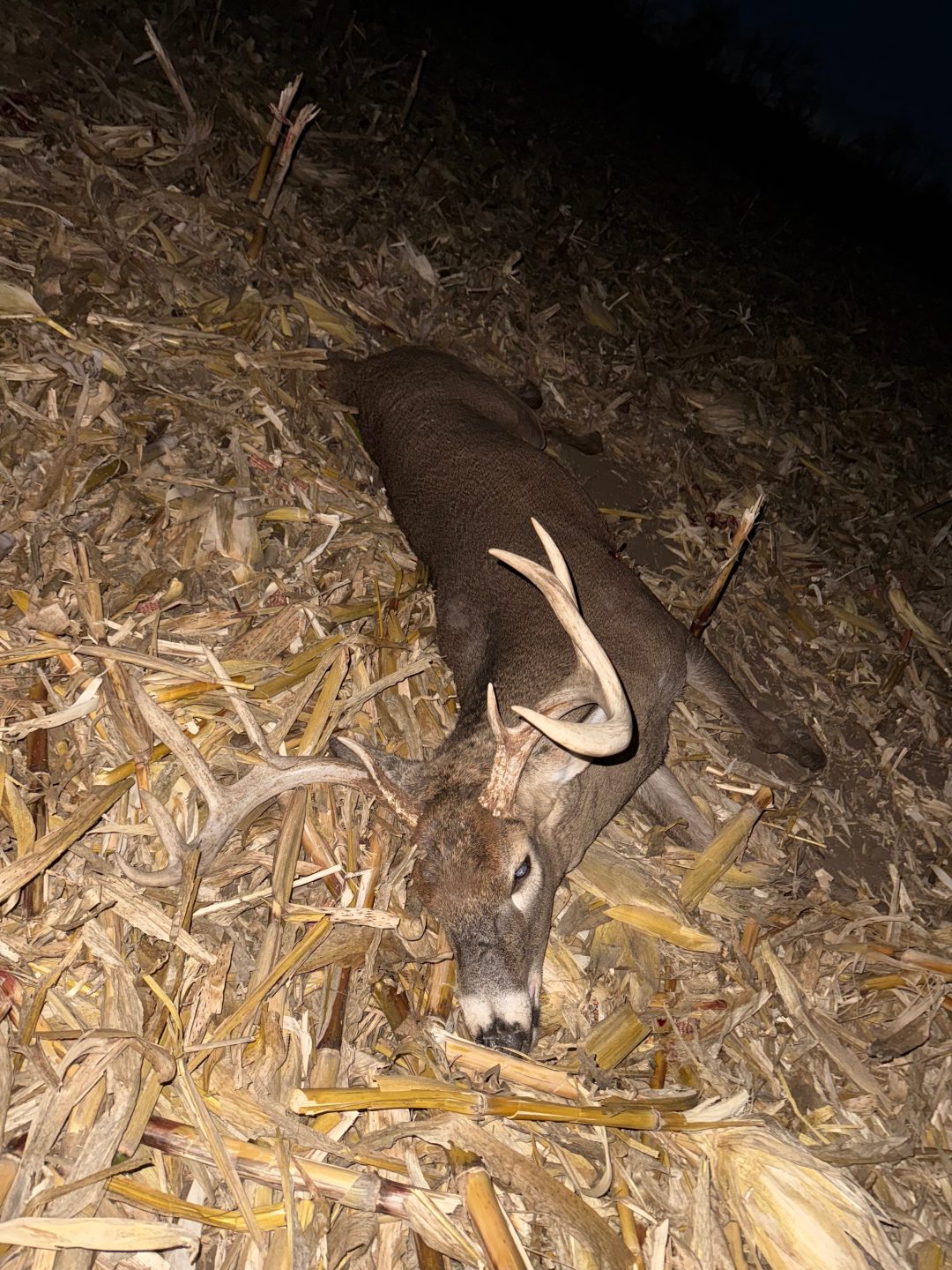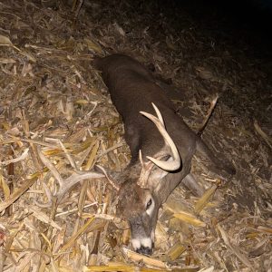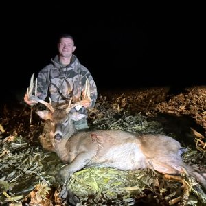After at least 2 years of chasing the buck we called the “Big 9” it finally all came together. I had no plans of hunting that evening and headed out to change my trail camera batteries and figured i would sit for the last hour of daylight. As soon as I sat down the farmer started discing the field and I almost left, luckily he finished a half hour before dark. Almost immediately a bunch of small bucks started chasing does and out came the “Big 9” chasing the smaller bucks off the property. 2 minutes before end of shooting time he hit a scrape 2 yards away behind a bush. He got downwind 5 yards away and went to run but a smaller 8 point ran up to try and fight him while he was broadside 7 yards away. I took the shot and he went down 50 yards later.