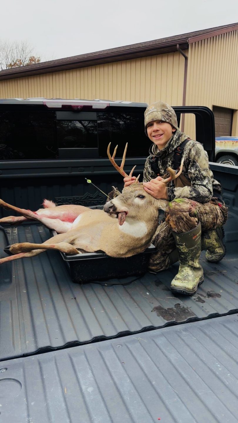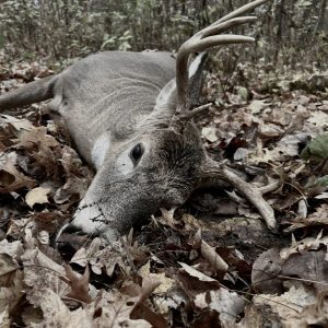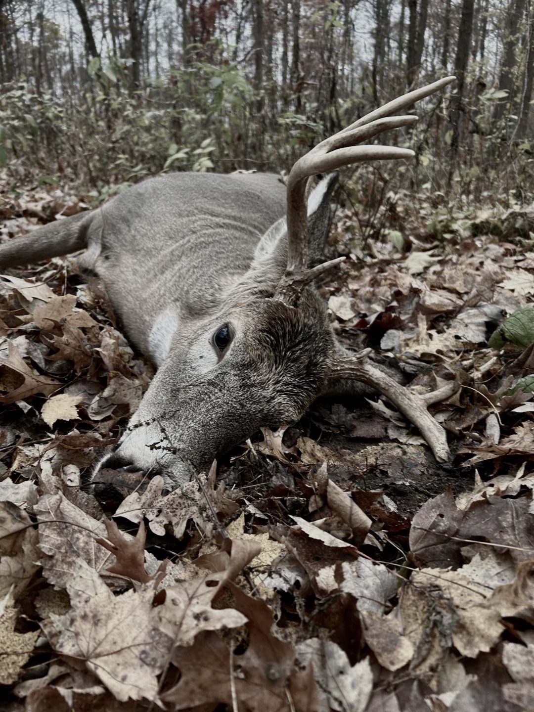 it was November 8th and I was sitting in the stand I have not sat in all year because the wind was right and he came out chasing a doe and I put a good old double lung shot on his and he ran 45 yards and it was my first deer with my compound bow.