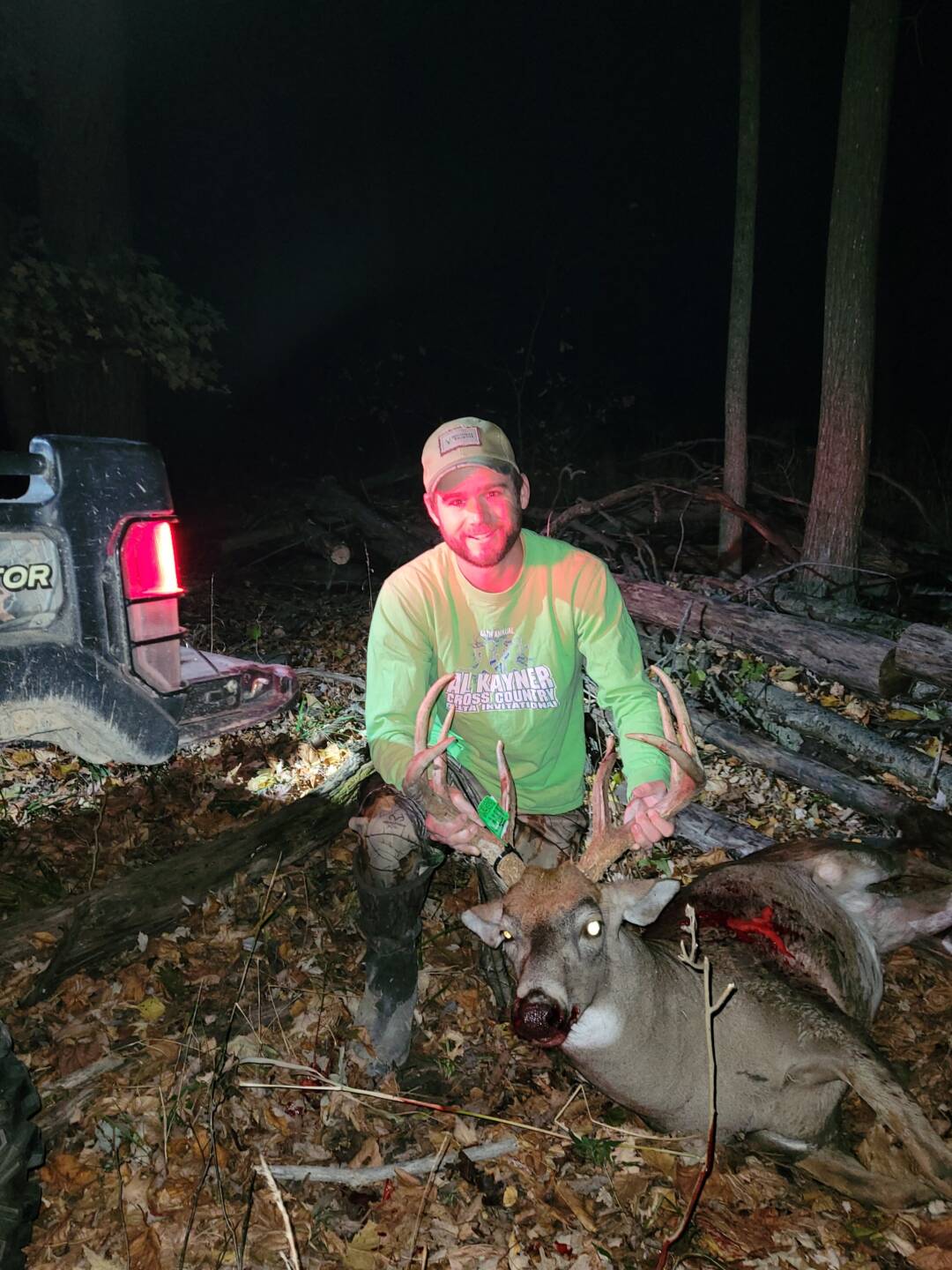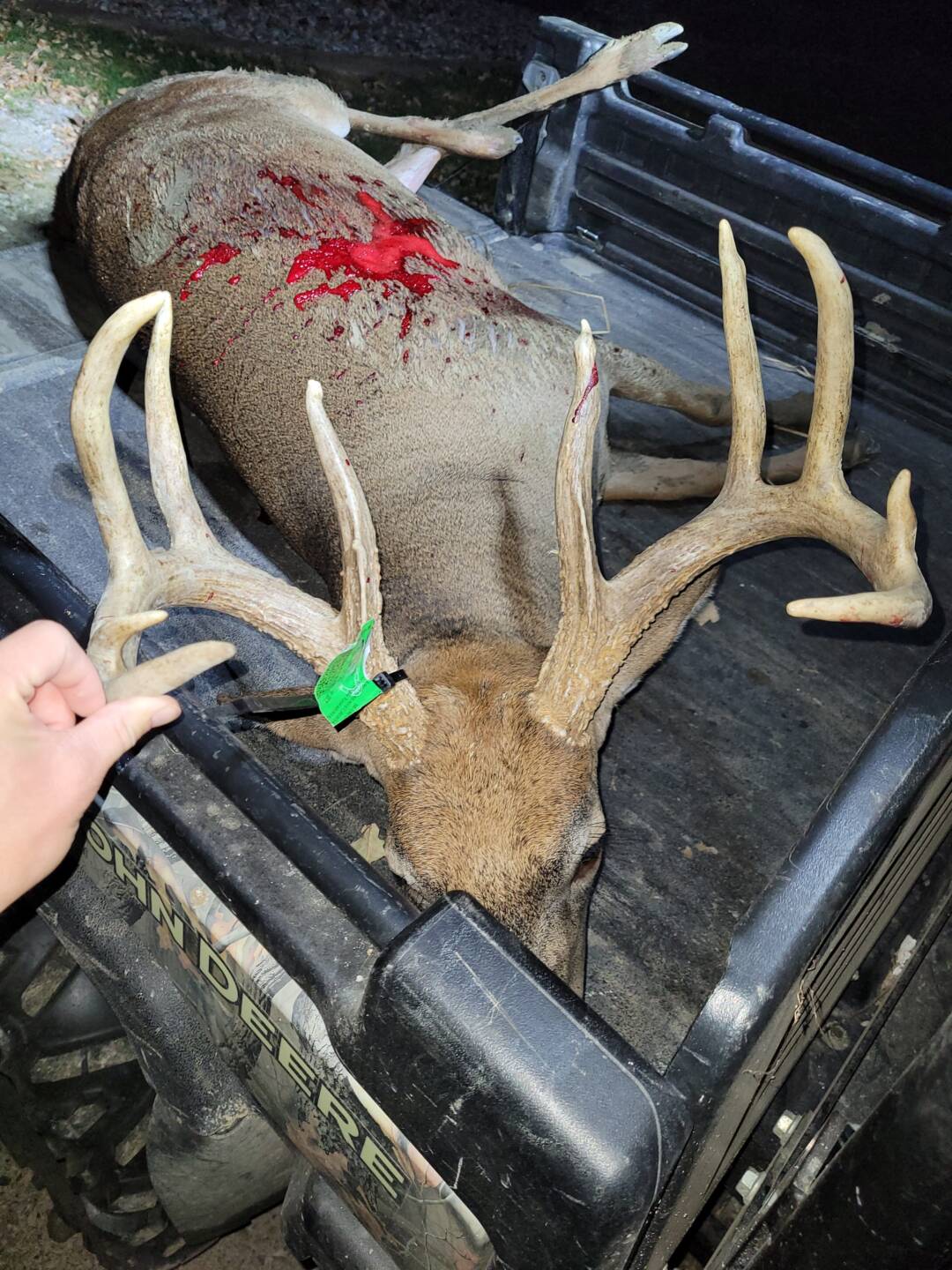 Made up my mind early I was sitting in the middle of the woods since all the crops were off from our section already and figured with the heat they would stay innthe woods and boy was I ever right for once. Walked our ditch back to my stand and spooked a few does laying under my stand. Didn’t take long to start seeing deer and when I did it never stopped. Most were 50-60yd for 2 hours straight. Probably saw 15 different bucks. Saw this guy acrossed the ditch on the neighbors and then he surprised me the first time as I was trying to put a jollywrancher in my mouth and he came up the ditch. Tried getting a shot off then but he was behind some brush and moving does and other little bucks around. He then went back for 20 or so minutes and then I had 6 bucks moving does at 40yd from me and then came directly under my stand. Had 2 other bucks 30yd in a clear cut and then this guy came up out of the ditch to my right again. Put the range finder on the 2 other little bucks standing there as I thought he would follow them. He followed a doe slightly to my left so I ranged her instead and he walked the same path and the rest was history. I had 8 bucks all within 50yd when I shot him. Biggest buck to date and one of if not the best hunts I’ve ever had. Deer even stayed around after I shot, had another 10 point at 30yd but I only get one buck tag a year plus he was too young.