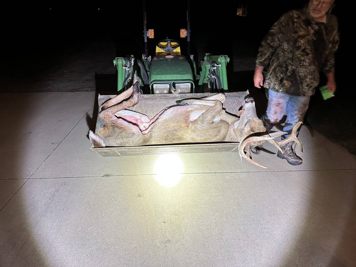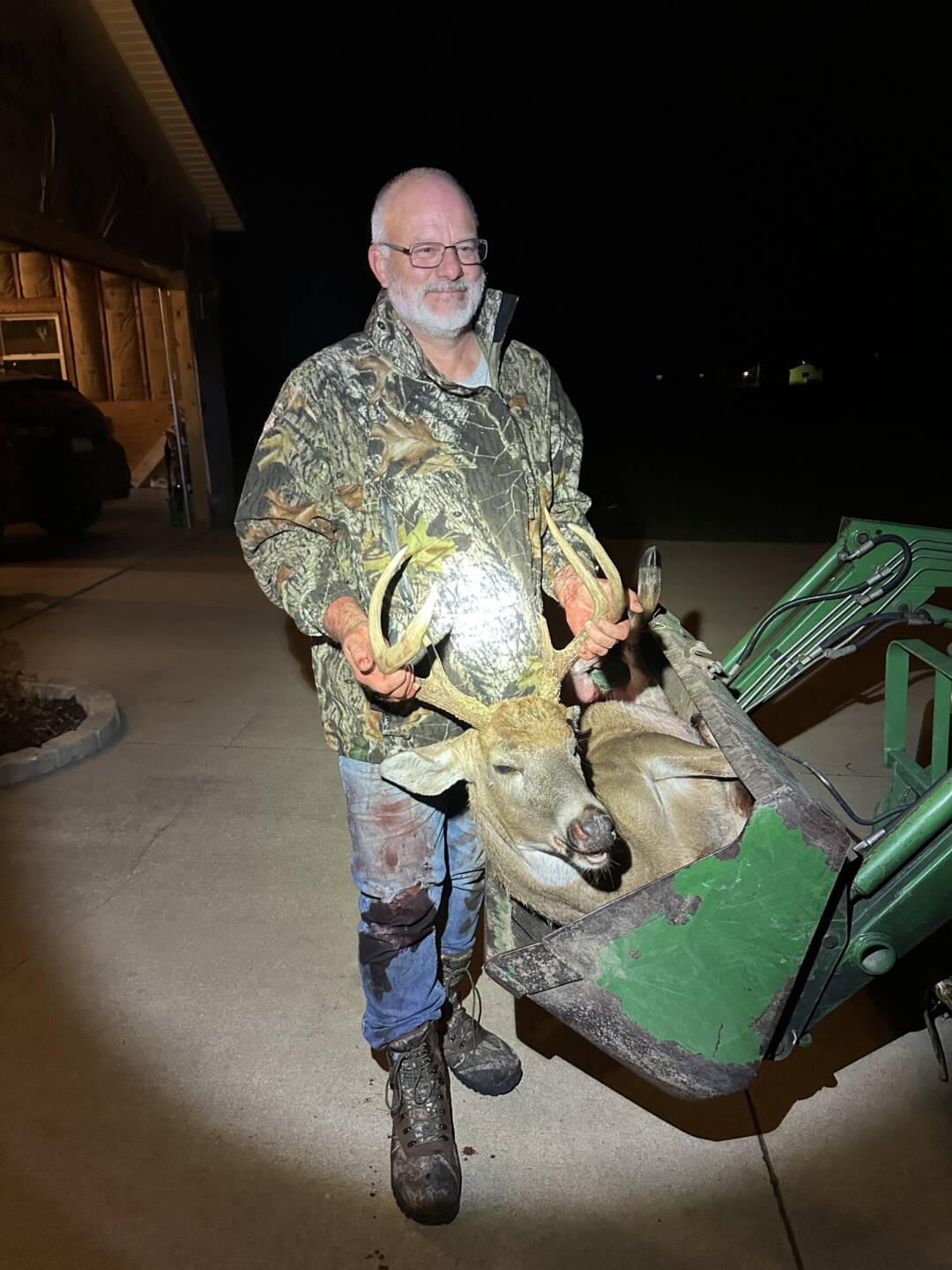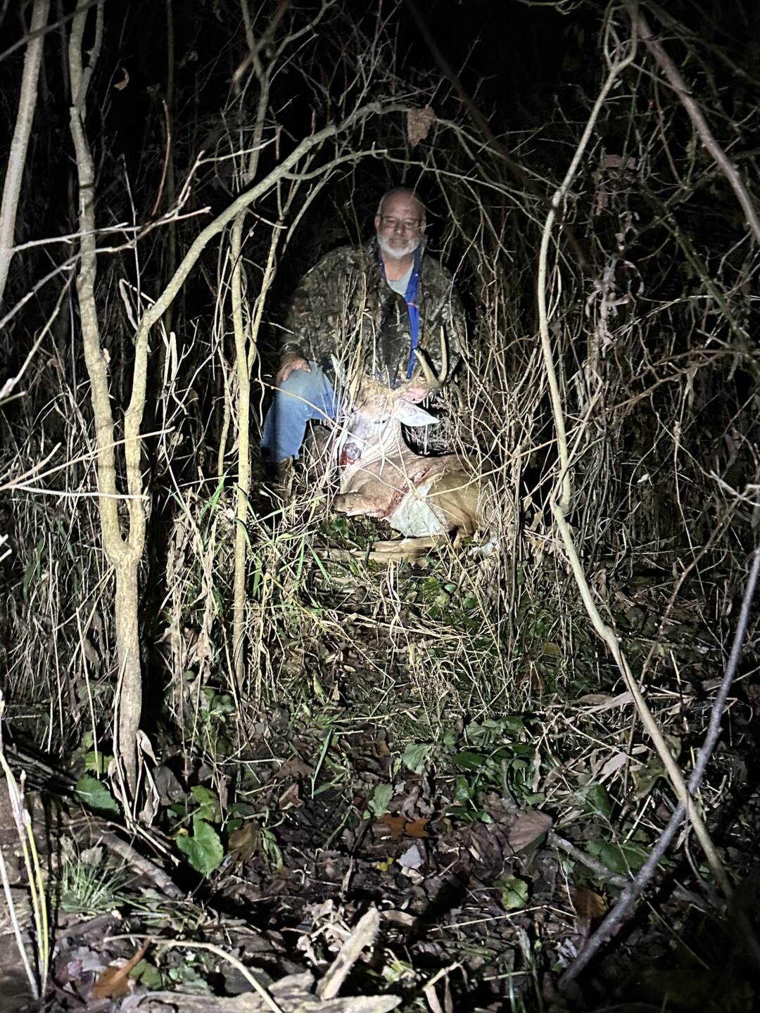 My wife has seen this buck leaving for work around 3am nearly every morning. Daughter spotted him coming out corner of woods on the property next to ours, he wandered up that property and she texted me letting me know he was coming. About 10 minutes later he wandered into our property 30 yards in front of me, broad side. Took the shot and he ran. My daughter saw where he ran in the woods so after letting him sit an hour we went and tracked him 50 yds back into the woods where he laid.