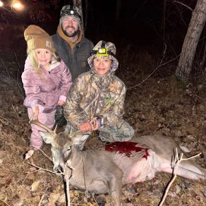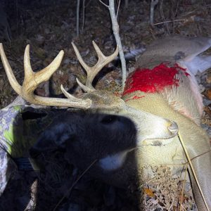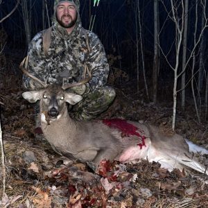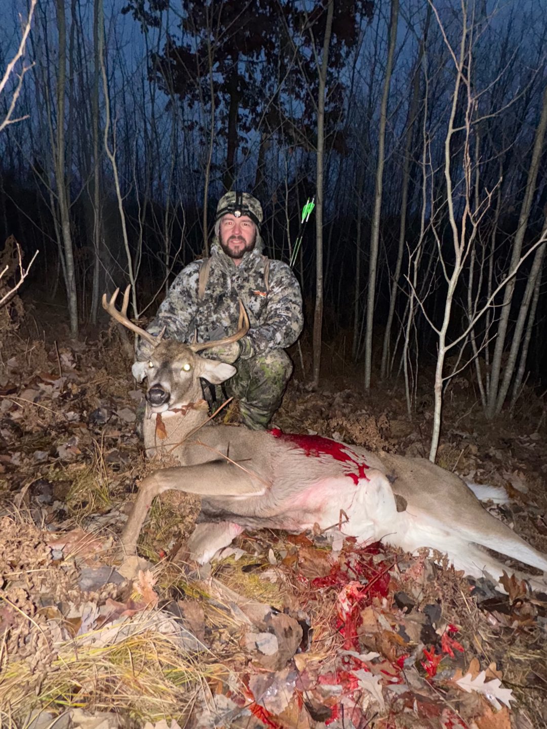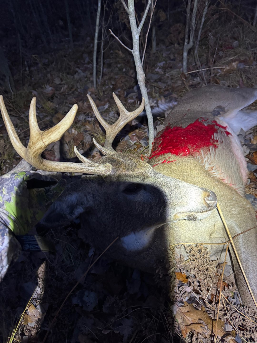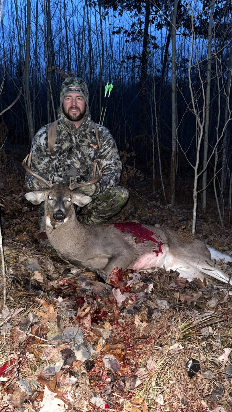 5:22 came in chasing a doe stopped at mock scrape at 20 yards. Double lung and heart hit with rage hypodermic, ran 32 yards and back flipped