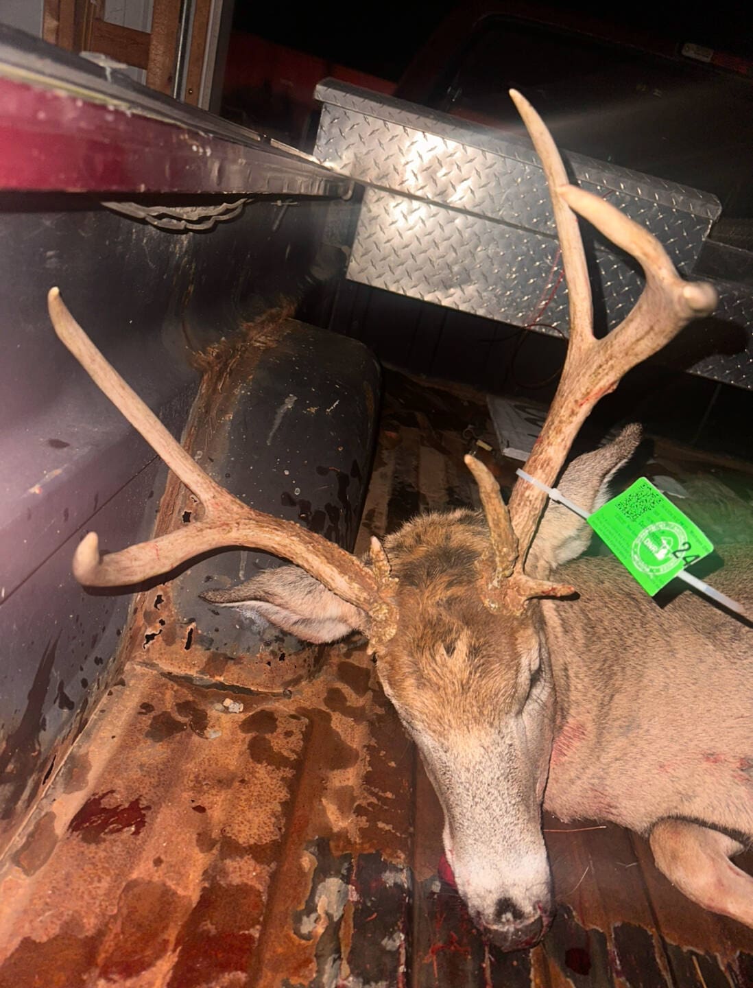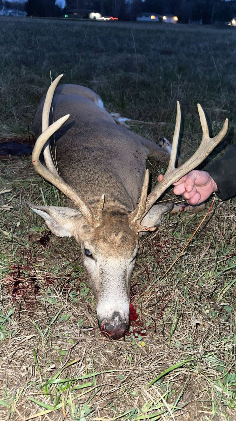 Me and my dad had been hunting the neighbors property when, he had mentioned the idea of checking around the block and checking our own hay field. Then not 5 minutes later he had text me to come up to the truck and we headed over to our hay field, saw him then got a shot off and dropped him. Has a kicker on the left antler