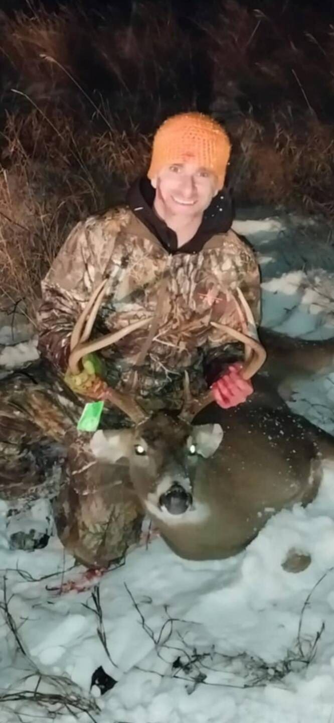 I’m a professional butcher and novice hunter that sometimes gets lucky! On December 1st at 5:36 PM, I accomplished a long-awaited goal: harvesting my first deer with a crossbow. The buck was standing 16 yards away when I lined up the shot, steadying my aim and releasing the bolt. It struck perfectly, hitting both the heart and lungs— a clean, ethical shot. The deer took off, running about 50 yards before dropping.