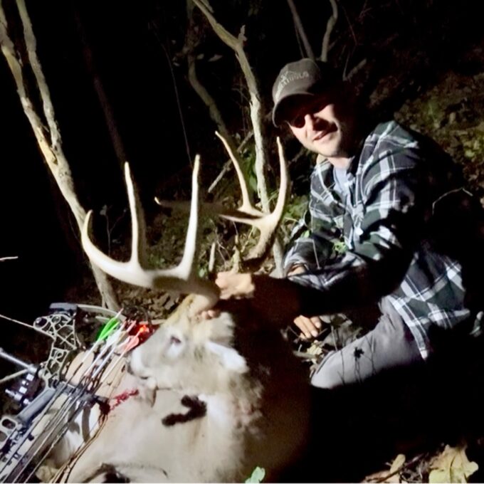 Hunting a creek separating a bedding area and some oaks. He came in around 7pm but because of how thick it was I didn’t get a shot till 7:15. Shot him and he ran back across the creek and piled up.