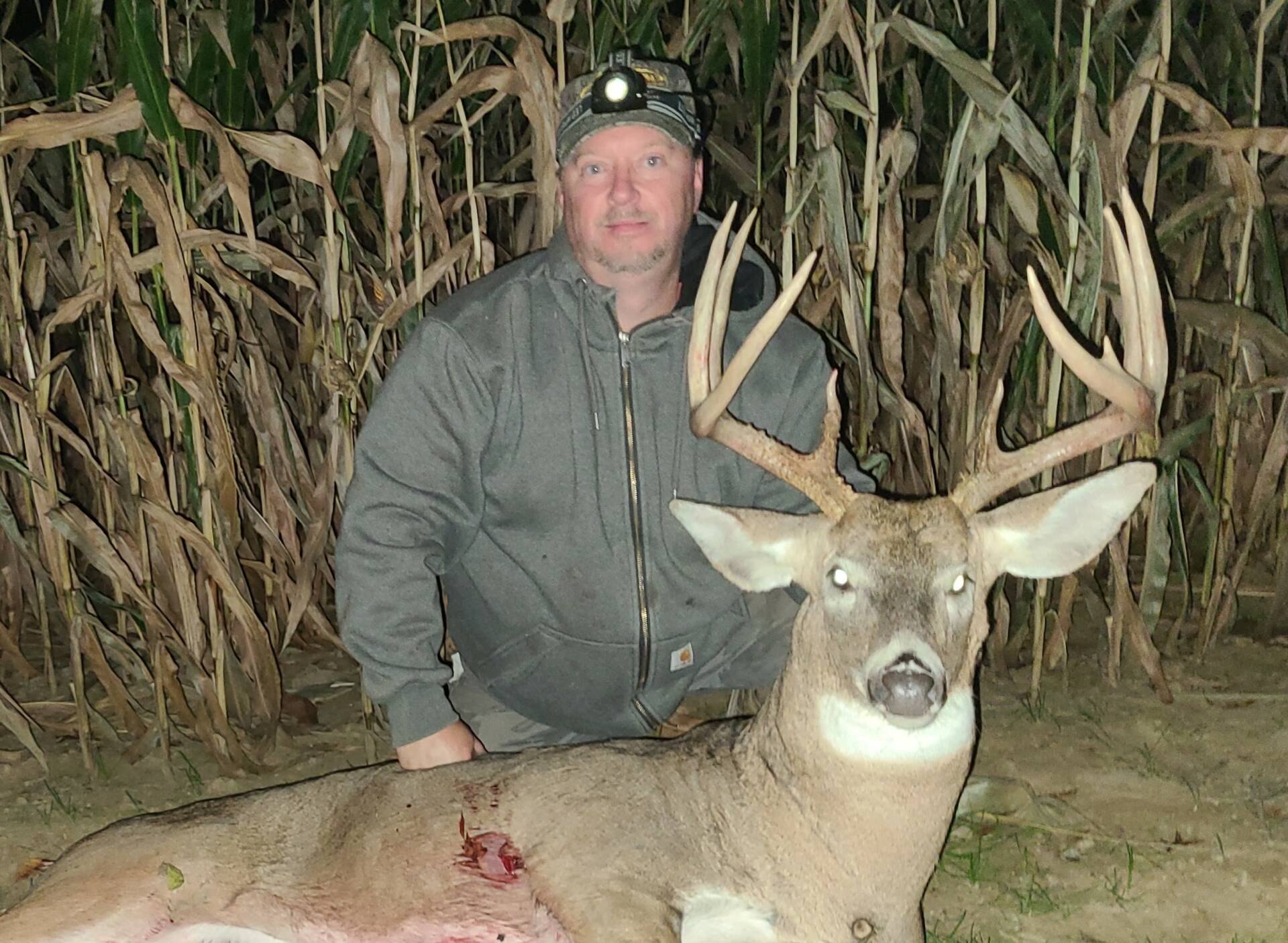 Had 2 small bucks bumping some does around in the corn, then they walked back in the beans behind me so as I turn around to watch this guy is coming straight for me, passed them up and came right to me broadside. Stopped him at 28yds and let it fly. Ran 80yds or so and dropped. Great evening in the stand!!