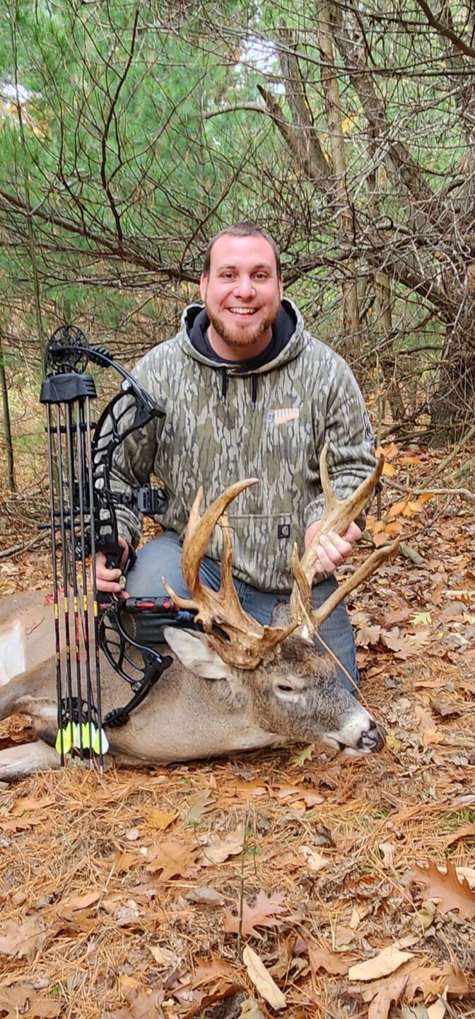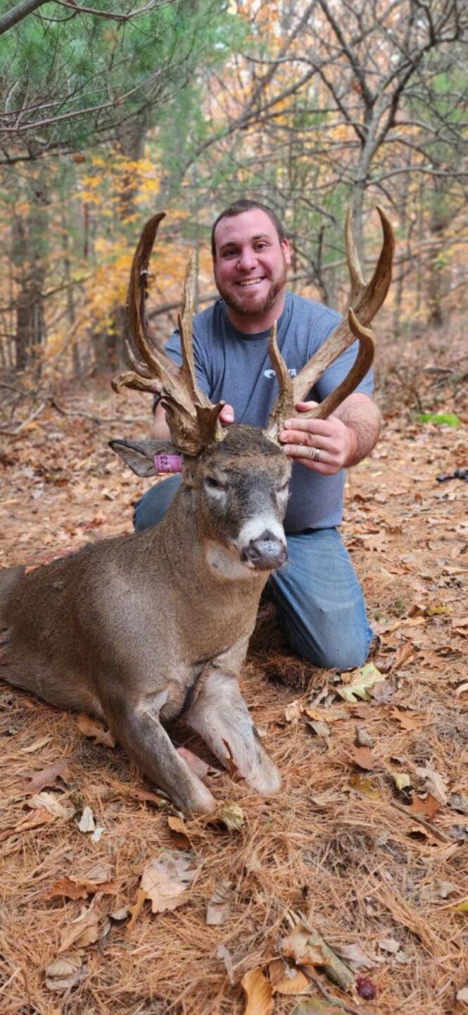 Watched a doe come down the ridge to 30 yards. She laid down looking exhausted. I looked up the ridge and saw a big body deer walking down to the doe. I grab my grunt call and give it a grunt. The deer answered back with a snort wheeze I grunted two more times, the deer is now getting to the doe and he put his antlers under her butt and stood her up. Just as soon as she stands she starts running back up the ridge he chased her and turned her around back down the ridge to the same spot. Ended up doing this 2 more times. He finally gave me a 45 yard shot. Hunt of a lifetime! I could not believe what I had shot.