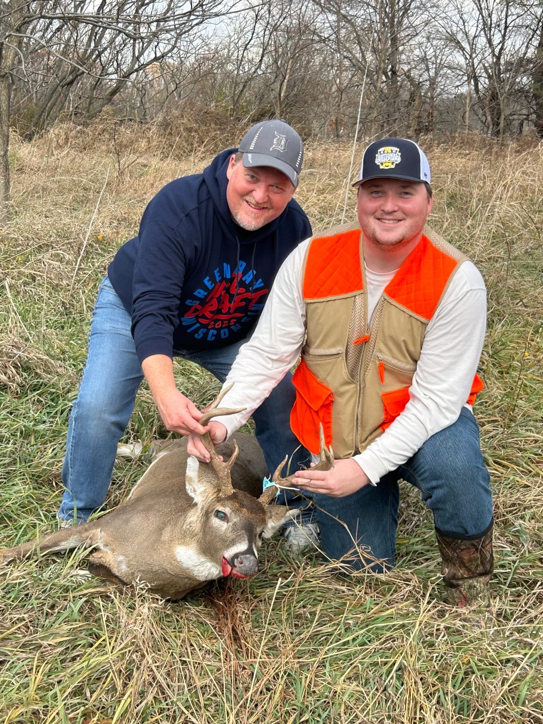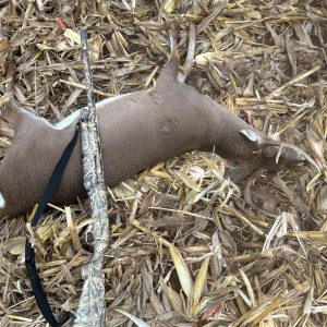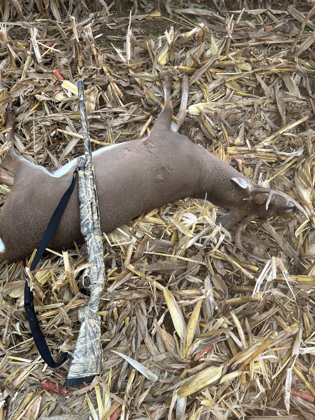 Spent the morning watching a few small spikes and a couple does before 2 bucks came out and began chasing the does around 7:45. The larger of the 2 chased weaved in and out of the remaining standing corn in the field, taking away any possible shot. The smaller buck ended up running below my stand, chasing the remainder of the does in the field in front of me of me. After everything died down I thought that I was done seeing any more deer for that sit and got on my phone to text with some buddies and see how their hunts are going. Just as I finish up typing, I look up to see this buck working its way across the field at 8:10. I stand up in the stand for a better view and it appears that it will go into the corn around the same area the previous buck did, so I decide to take a shot thinking that it’s the only chance I would have, believing it’s around 50 yards. I drop him in his tracks, and come to find out upon retrieval it was over double that distance at about 118 yards. Not bad for shooting open sights on a 12-gage bird barrel shotgun! First opening day buck, and first buck in 8 years. Extremely grateful for the opportunity, and to share the weekend with my Dad whose birthday was the day before!