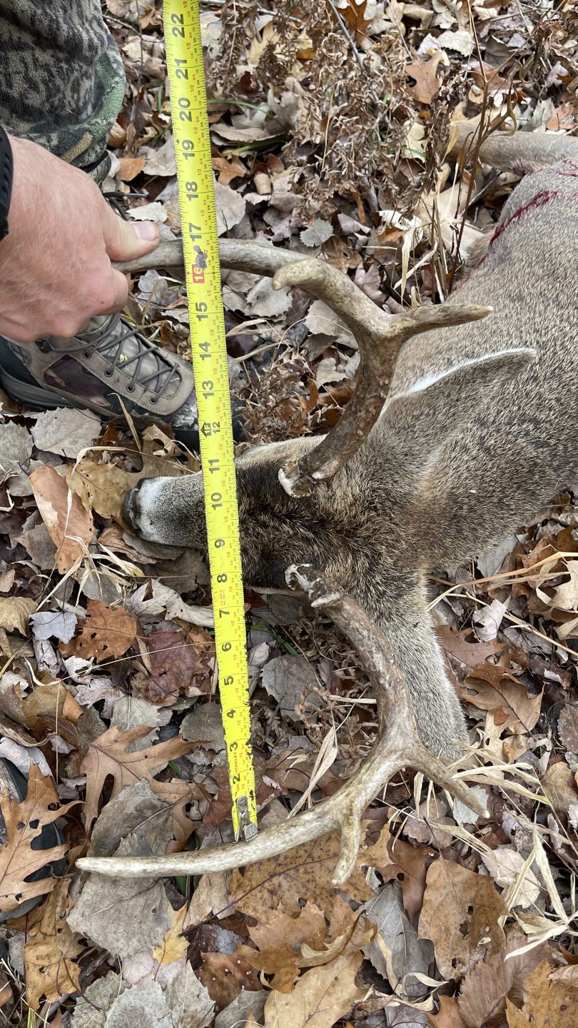 I was watching a smaller buck in my binoculars. I noticed movement past him, i panned over And seen him & how wide he was…. Threw the binoculars down & had to get my gun up.