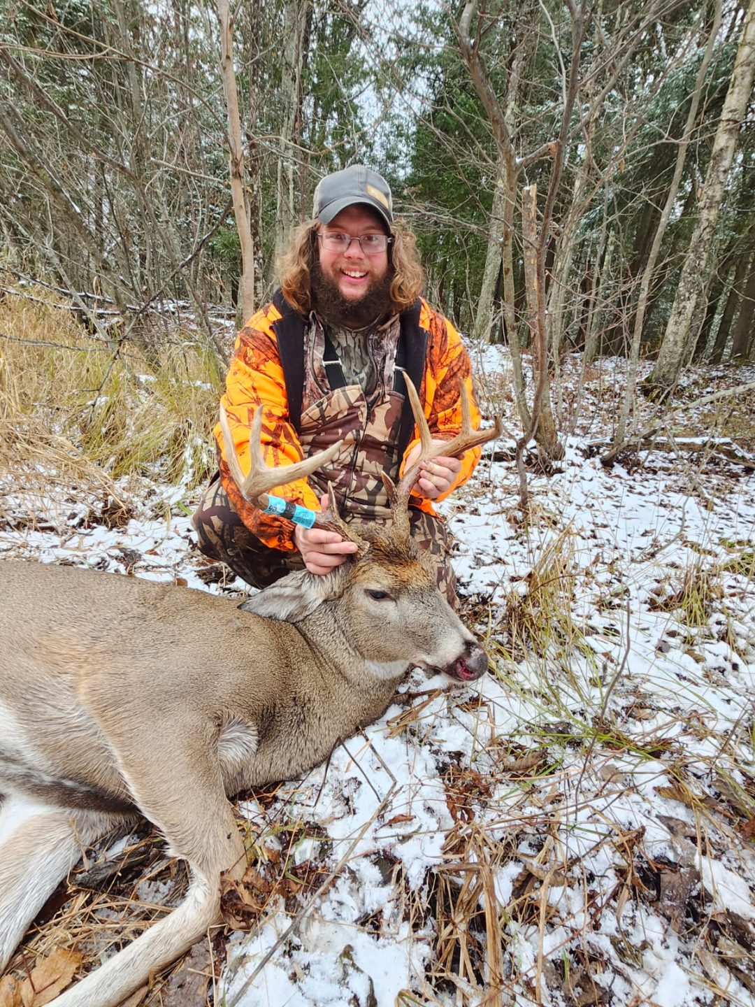 Hunted in the snow and strong wind, as I was leaving I heard crashing coming from a swamp. A doe ran out followed by three different bucks. This was the last buck and the largest. Shot on the run at 10 yards and dropped in his tracks.