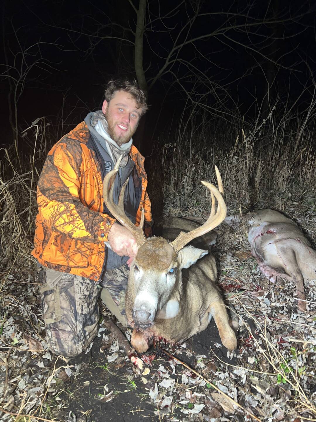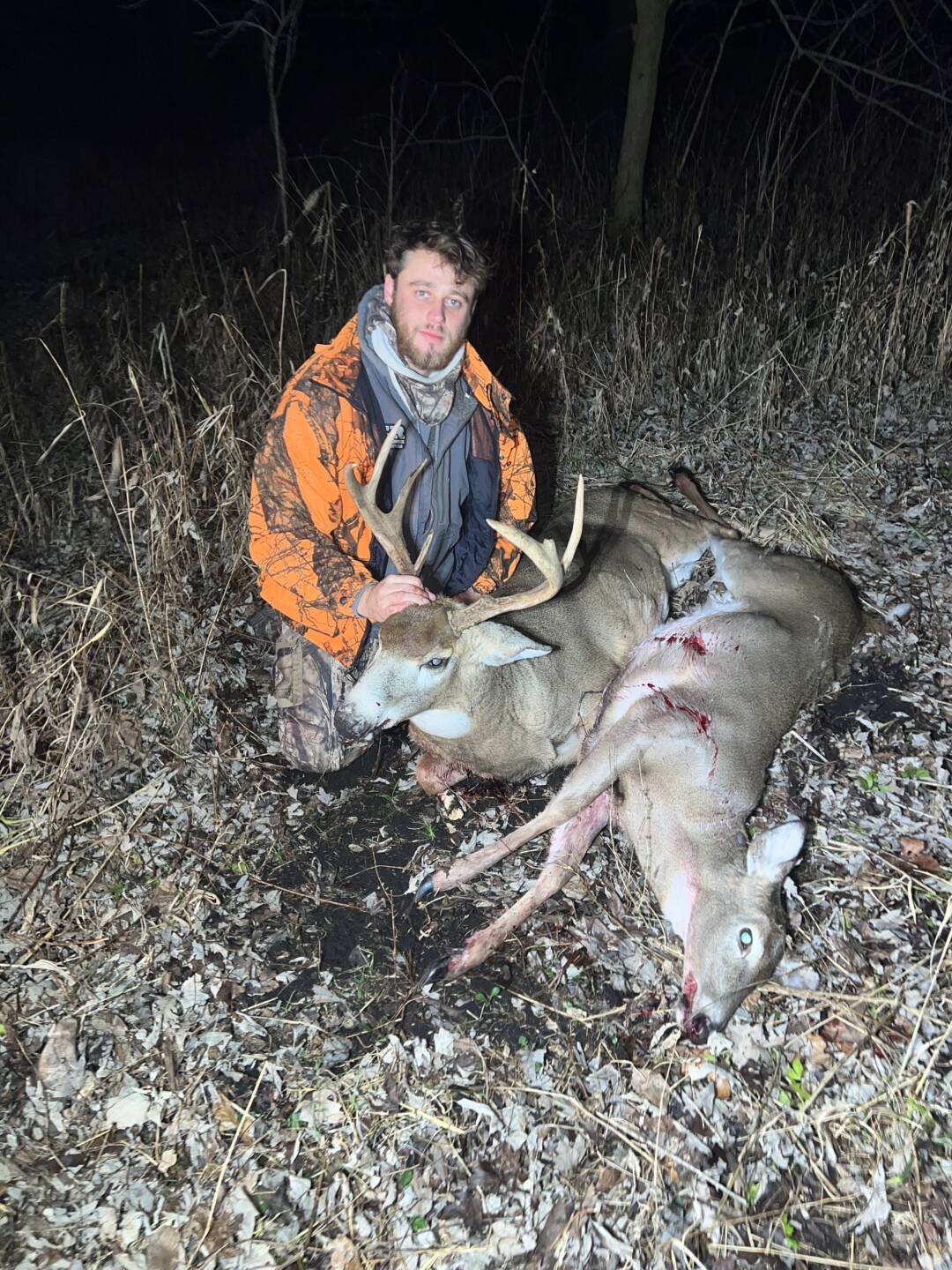 My buddy and I headed down to the woods just before 3. We sat in two different stands on each side of the woods and I had moment pretty quick but not a buck in sight for the first two hours of the sit. With only 30 minutes left, I was getting ready to take a shot at a big doe on the Field. Out of nowhere I heard a really loud grunt from behind me. I turned around with my gun and he was coming into the woods chasing a doe. He stop on the wood line and I had a clear shot. I smoked him at 40 yards, He went about 10yards and dropped. About 20secs later I took a shot at the doe and she booked it! So my buddy ended up taking a follow up shot before she hit the property line and she dropped.