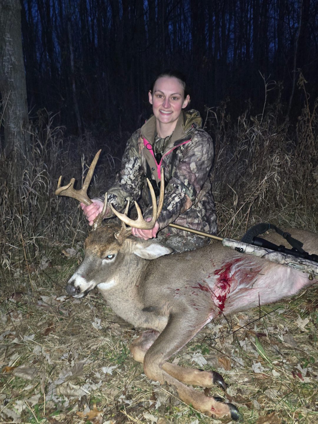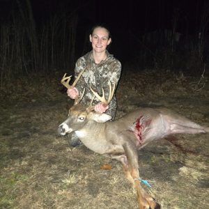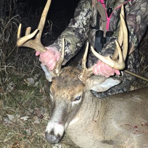 Opening day was pretty windy, so I wasn’t sure what I would see. Around 5pm I saw a buck and realized it was the 10point I had shot previously. Never did I think I would get a second chance at this buck, but he walked in and I took the shot at 30yards. My first deer on opening day.