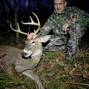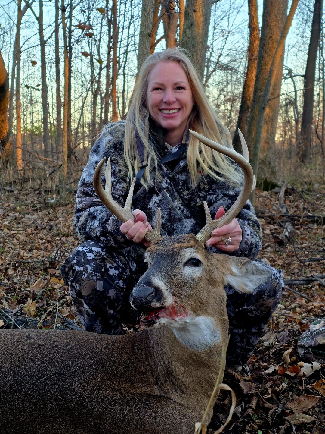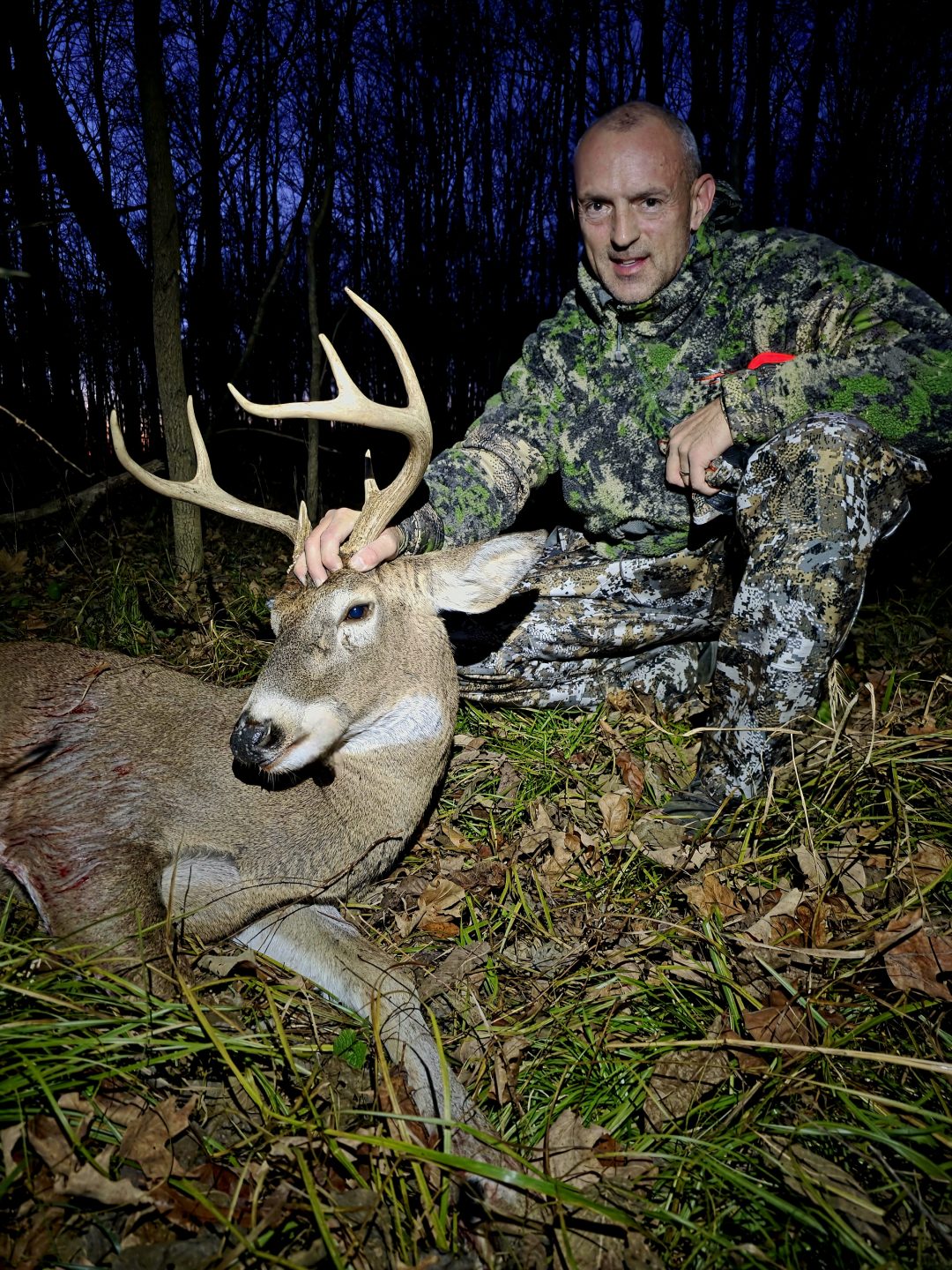 Sat through 70 degree opener and 25 mile wind gusts not seeing much until the last 20 minutes of shooting light Sunday evening. My wife shot hers at 510pm. We confirmed it was down and she said ” We still got 45 min, I feel lucky” I texted her and asked if she was ready at 545 and she agreed. Was closing up the blind only to have mine come out chasing a doe. Fun evening in the woods and feeling blessed