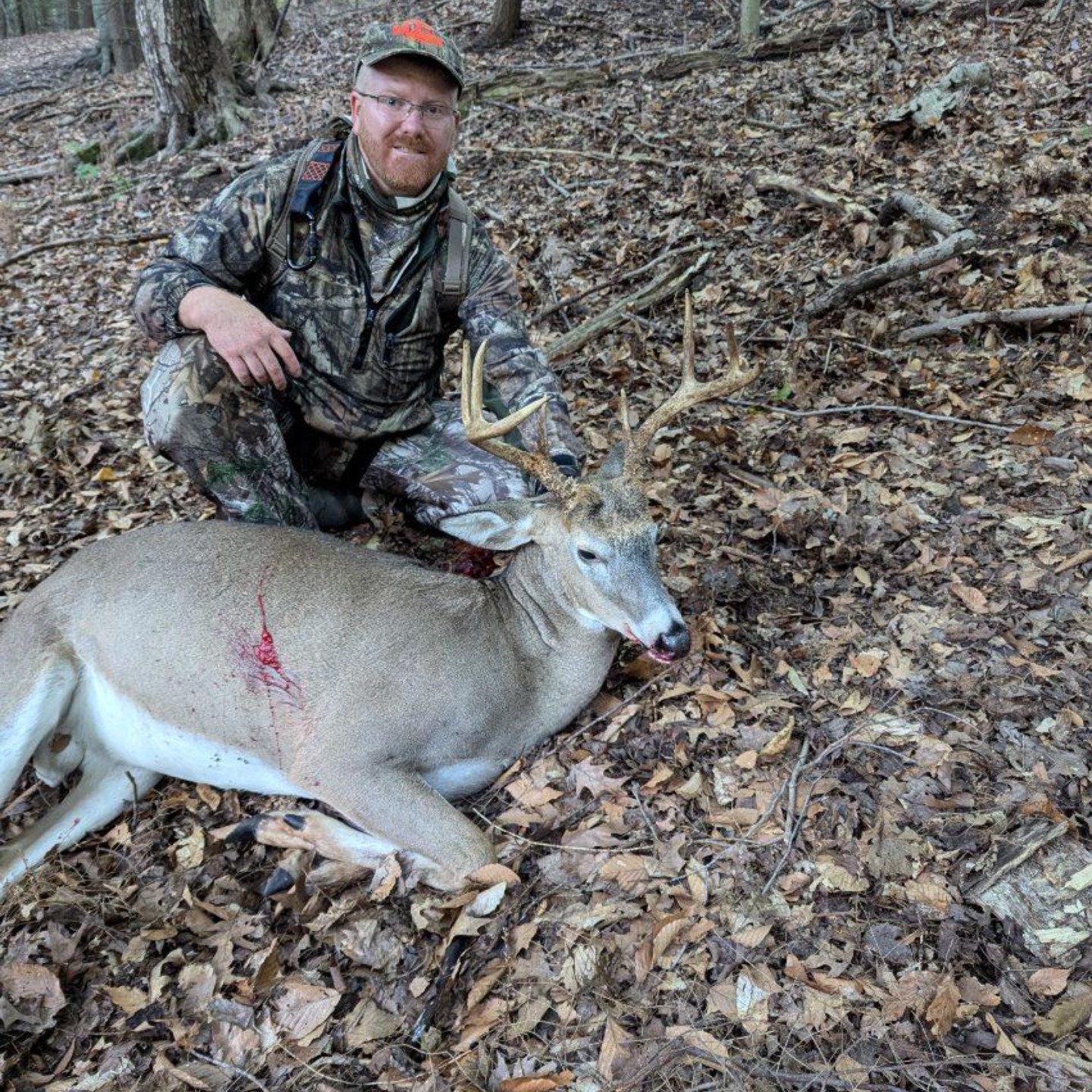 Saw him working down the ridge in my direction. He took his time walking and eating acorns. Stepping behind a tree at 25 yards I pulled back and waited for him to clear the brush. Clean pass through at 20 yards and watched him pile up 50 yards from that.