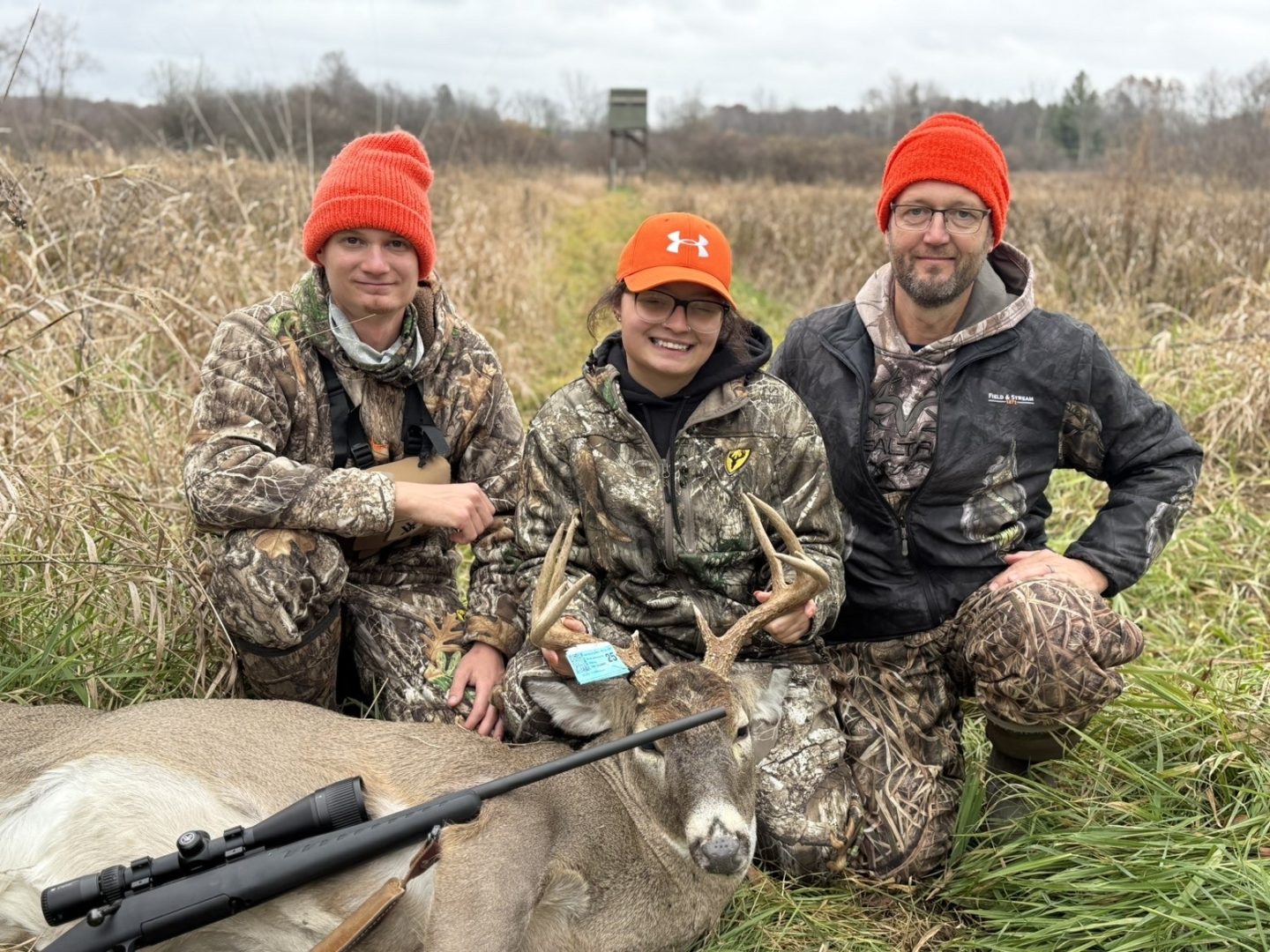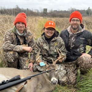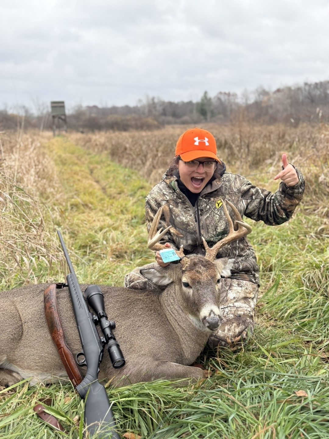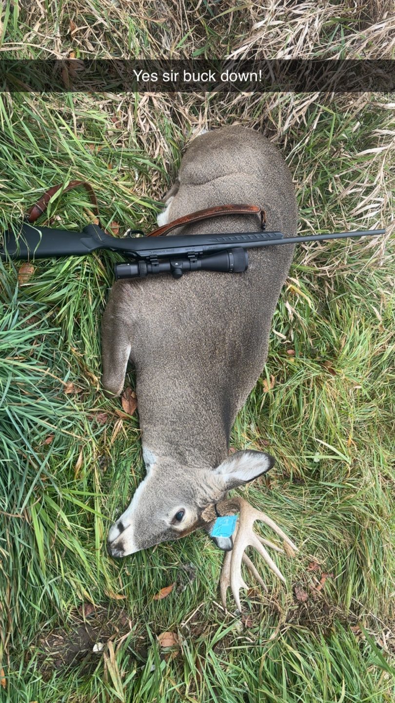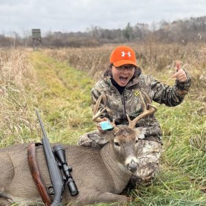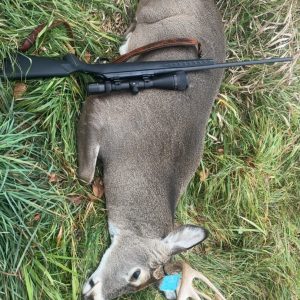 My very first buck ever! Went out around 6 ish and around 830, my boyfriend pointed him out at the top of a hill and I thought I missed the chance to get him because he kept on walking didn’t stop. Not even ten minutes later he came down the hill out of the tree and stood perfectly in the middle of the trail for me and I shot him at 80 yards at least and he dropped no further than 10 feet from where I shot him.
