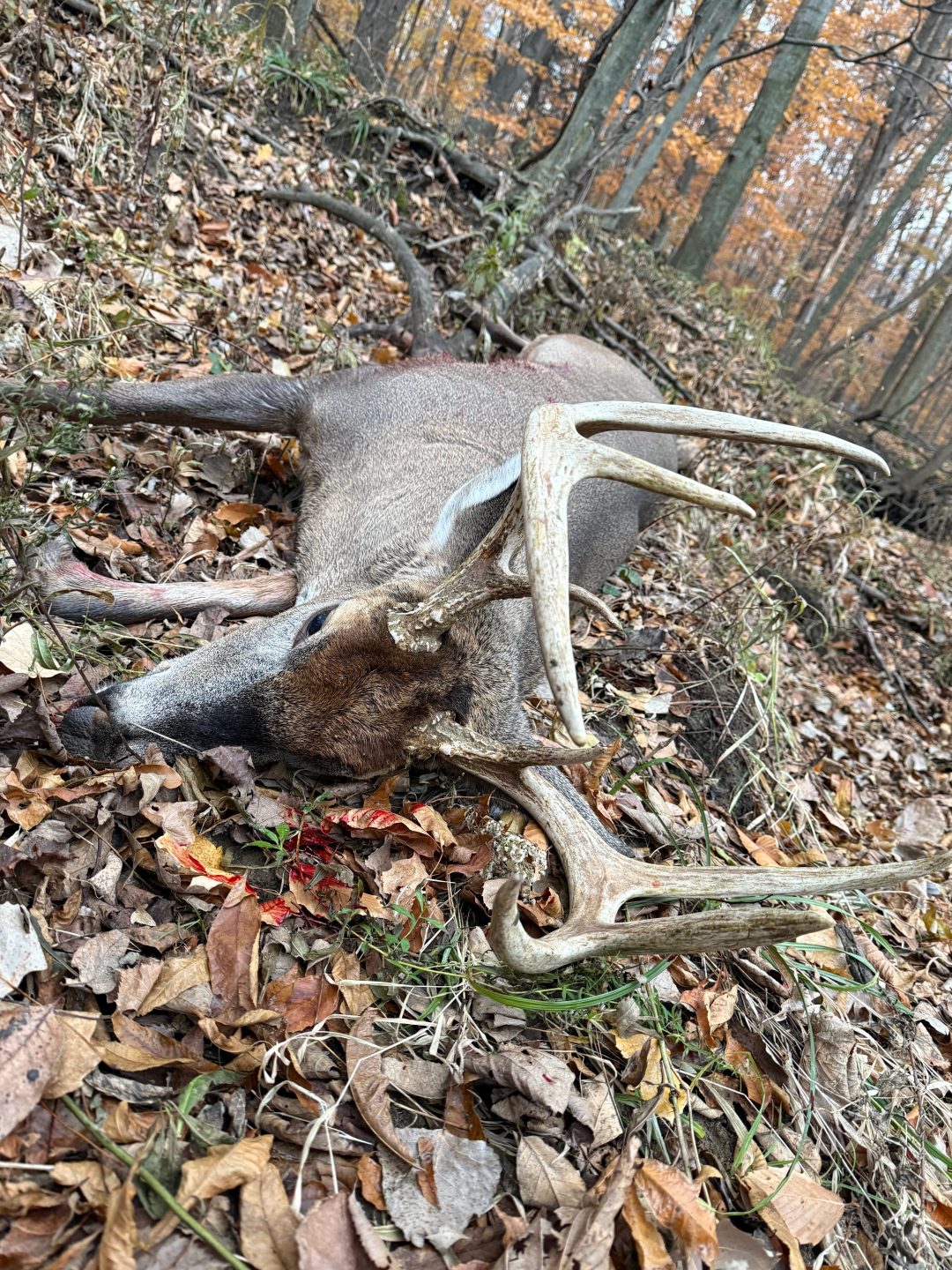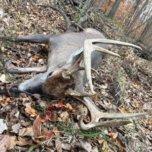 He came in grunting after a doe, stopped up at 120 yards. Took a shot at him, watched him run around the field, and come within 75 yards. Put another shot in him and watched him land in the creek. Compliments to the .450 bushmaster for getting it done