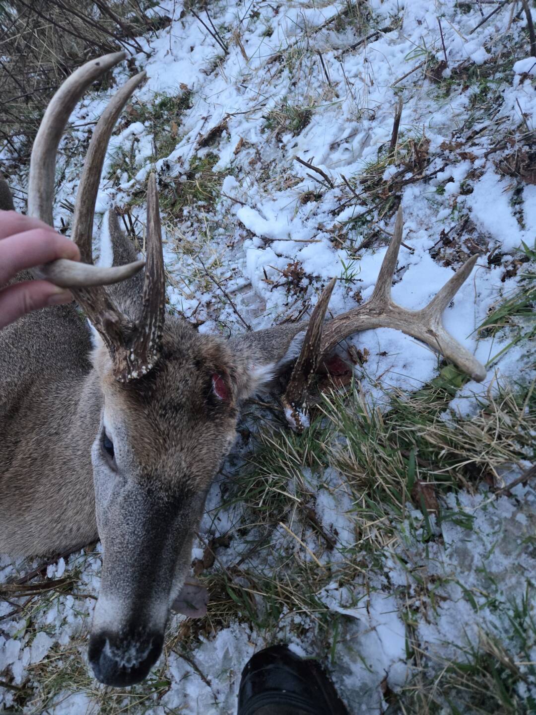 Just got done watching the neighborhood cat kill a mouse. Looked up and he stepped out. Pulled up, got him to stop and shot him all in about 10 seconds. He didn’t go 20. Found him and he busted off one side of his rack when he went down. I’ve never seen this deer before tonight. That’s hunting in December for ya.