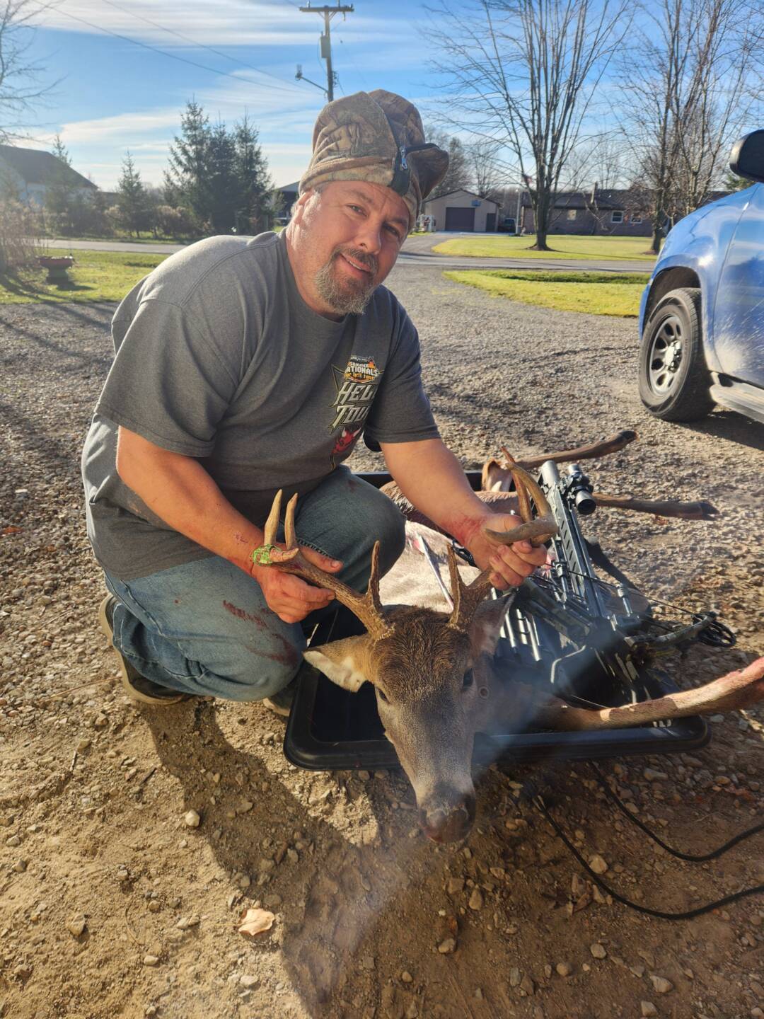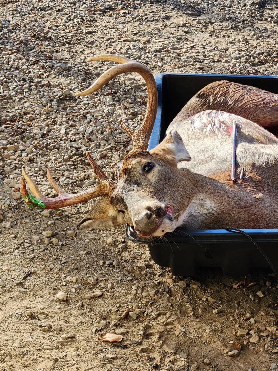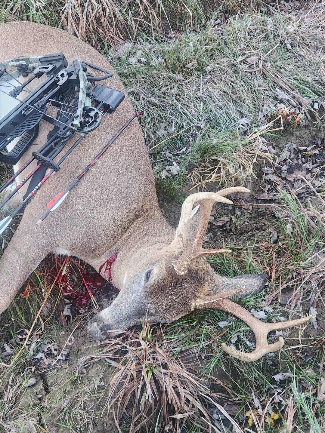 He popped.out from behind my ground blind at about 7 yards. Was quartering away from me at about 20 yards and I was afraid I wouldn’t get another shot at him. Dropped in his tracks with the neck shot. With not having many deer in our area, I was happy to harvest this guy.